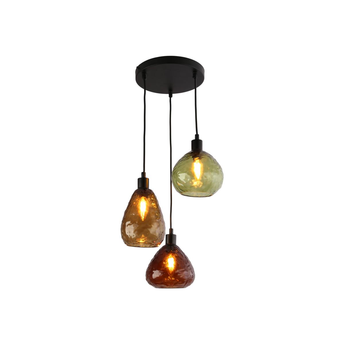 I love this three-light fitting for its modern, yet slightly industrial look, making it versatile across a range of interiors. It works particularly well in open-plan spaces, kitchens, or dining areas where you want to create a warm, inviting glow. The coloured glass shades add a touch of visual interest without overwhelming a room, making it suitable for contemporary, Scandinavian, or rustic-inspired schemes. For styling tips, consider hanging it at different heights over a dining table or island to create depth, or pair it with minimalist furniture for a balanced aesthetic. Practicality-wise, it offers great flexibility and a focal point that can lift the entire space without seeming too fussy.