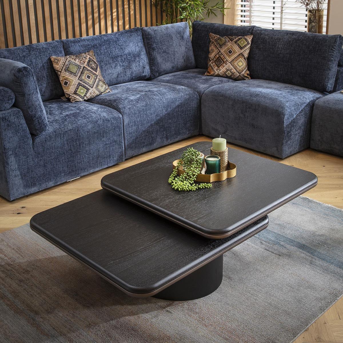 This stunning rectangular coffee table features a large black oak veneer top and a dark brown metal painted base. This modern coffee table boasts a unique two-tiered swivel design, perfect as a bold centerpiece in any living space. Its sleek lines and minimalist style seamlessly blend with any decor. The Asher coffee table's design is both eye-catching and functional. The two overlapping leaves create a tiered tabletop, adding depth and visual interest to your room. Its rectangular shape, measuring 120cm wide by 80cm deep, offers ample surface area, making it an ideal choice for those who appreciate both style and practicality. Crafted with a black oak veneer, the tabletop exudes sophistication and elegance. The unique two-leaf design not only enhances its modern appeal but also serves as a conversation starter. This modern coffee tables versatile surface is perfect for displaying decor, serving drinks, or hosting a casual gathering. The bold black oak veneer, complemented by the dark brown metal painted finish on the base, makes this coffee table a striking piece in any room. The deep, rich tones of this black coffee table are ideal for blending with a variety of interiors, adding a touch of modern minimalism to your home. W120cm D80cm H36cm Durable Black Oak Veneer Swivel Tabletop Modern Rectangular Black Coffee Table