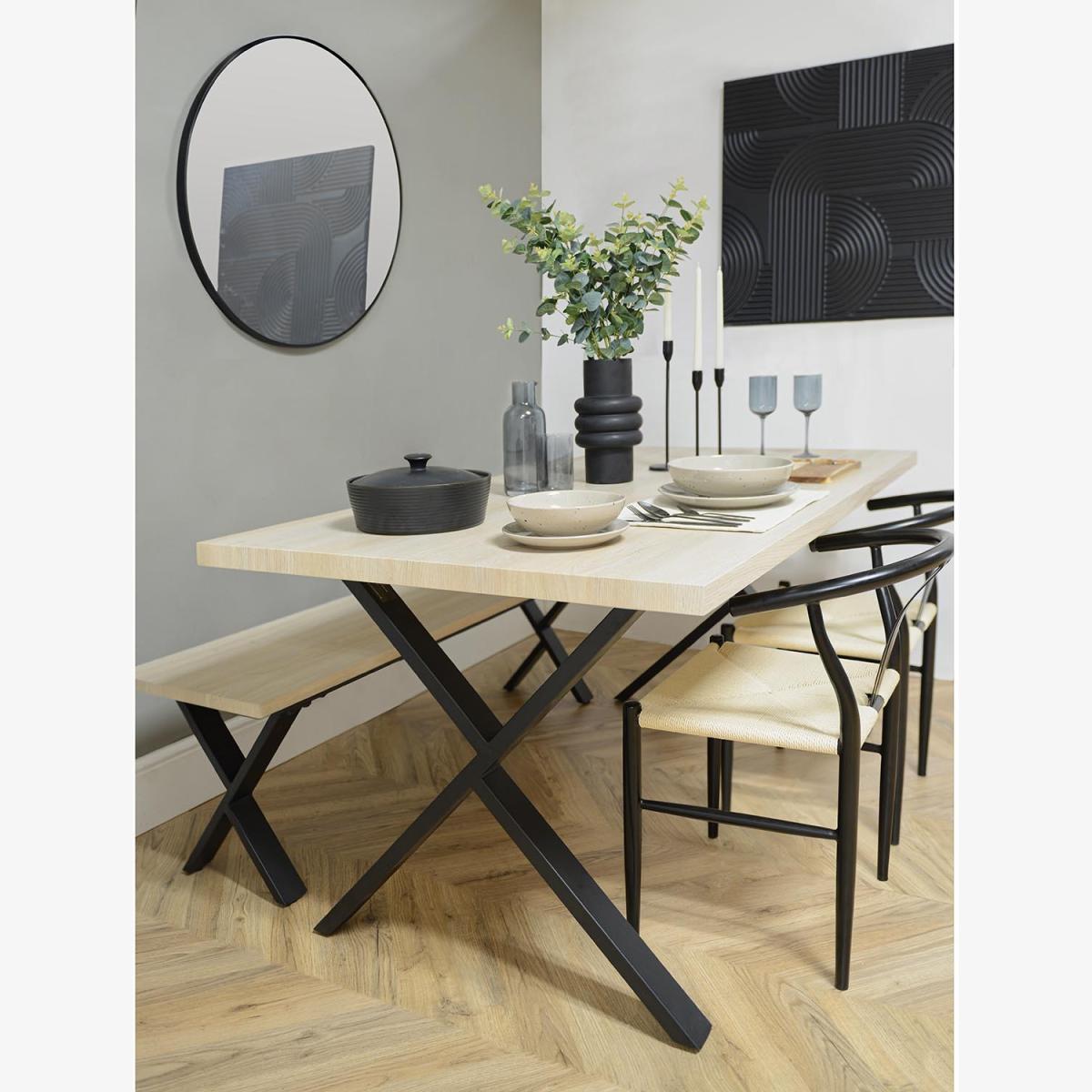 I’m a fan of this bench for its clean lines and the contrast between the pale ash-effect top and matte black frame - it feels fresh without being fussy. It suits Scandi-inspired dining rooms, modern farmhouses or minimalist hallways, and it’ll slot straight into an industrial-style scheme, too. For styling, layer a soft woollen cushion or two in natural tones, and tuck in woven baskets underneath for shoe or magazine storage. In a dining setting, pair it with mixed-back chairs to soften the look, and dress the tabletop with simple ceramics and a low vase of foliage to keep things practical yet pulled together.