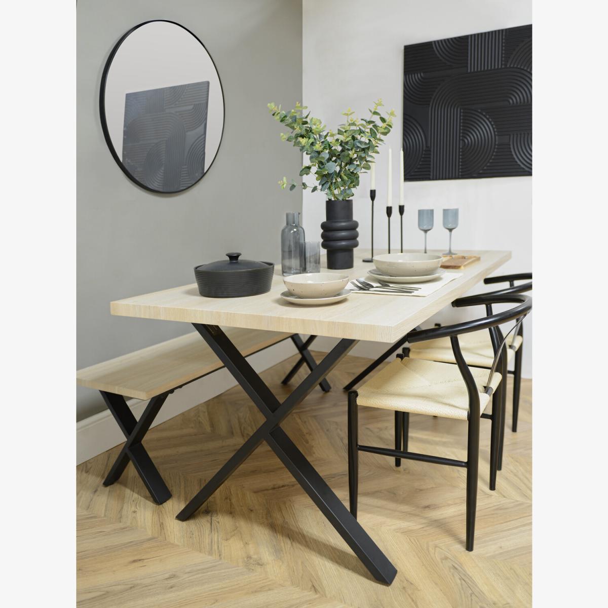 I’m a fan of this Ashford table for its clean-lined light-wood top and contrasting black metal X-frame - it brings a subtle industrial edge without feeling heavy. It works equally well in Scandi-inspired schemes, minimalist lofts or modern farmhouse dining areas. For a pulled-together look, mix in a bench on one side and slim black chairs on the other, then layer on neutral stoneware plates and a simple linen runner. A trio of glass vases or a low-profile ceramic bowl with seasonal foliage keeps things fresh and avoids cluttering the tabletop.