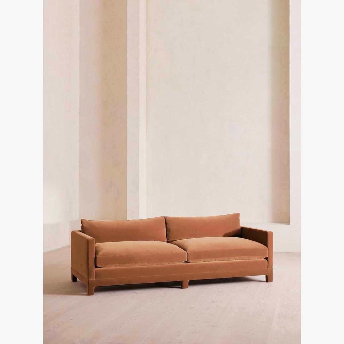 An angular, four-seater silhouette with deep, velvet-wrapped cushions primed for comfort. Characterised by angular arms and deep, comfortable seats, the Ashford sofa references the seating styles seen throughout Brooklyn's DUMBO House.