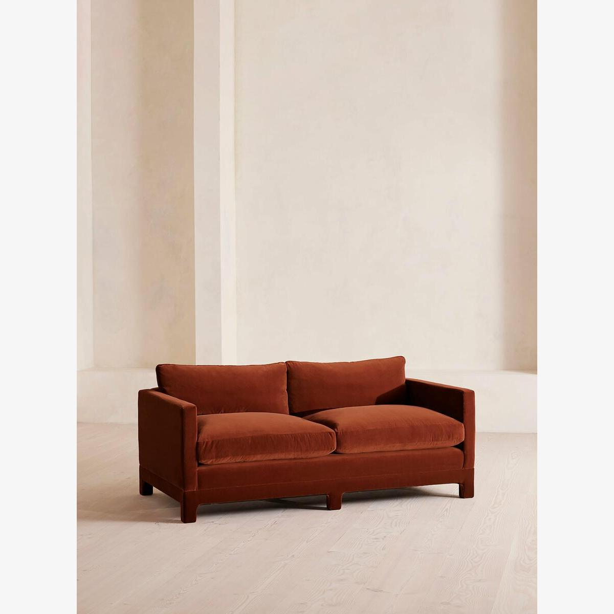 I really like this little two-seater because of its rich rust velvet upholstery, which adds warmth and a touch of luxury to any space. It works particularly well in eclectic, mid-century, or modern interiors where a pop of colour against neutral tones can really stand out. For styling, consider pairing it with textured cushions and a throw for added comfort, or place it alongside wooden or brass accents to enhance its vintage vibe. Practical tips include choosing a slightly curved or rounded coffee table to complement its soft silhouette, and keeping surrounding decor minimal to let the sofa be the statement piece. It's ideal for smaller living rooms or cosy corners where a bold but inviting seating option is needed.