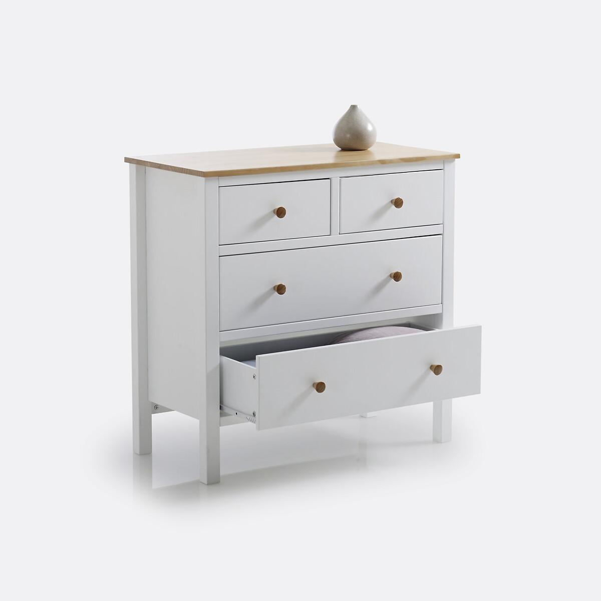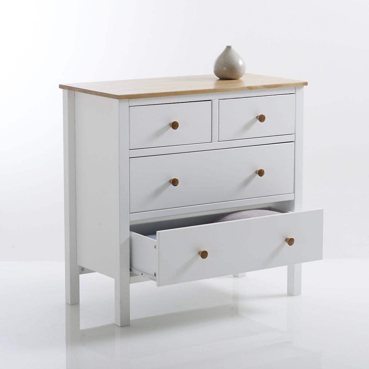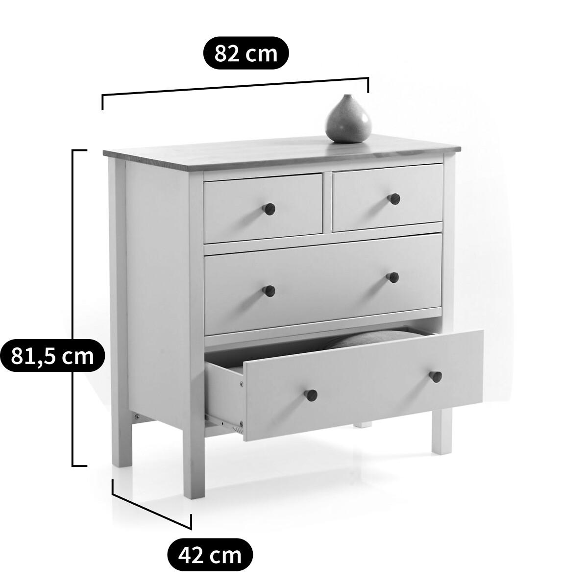 The Ashin chest of drawers brings a quintessentially British feel into the bedroom! Product Details:Structure and drawers in white lacquered MDF with a nitrocellulose coating. Product Details • 4 drawers : 2 large and 2 small • Structure and drawers in white lacquered MDF with a nitrocellulose coating. Dimensions • Width: 82cm • Height: 81.5cm • Depth: 42cm • Useable size of drawers : • Large drawers : L67 x H12.4 x D28.3cm • Small drawers : L29.5 x H10.5 x D28.3cmDelivery:. This product is sold for self-assembly. It will be delivered to your door. Note! Please check that all access points are large enough to accommodate your delivery (doors, stairs, lifts)Parcel dimensions and weight:1 parcel • L90 x H19.5 x D50cm • 32kg