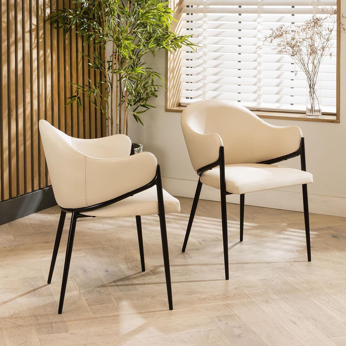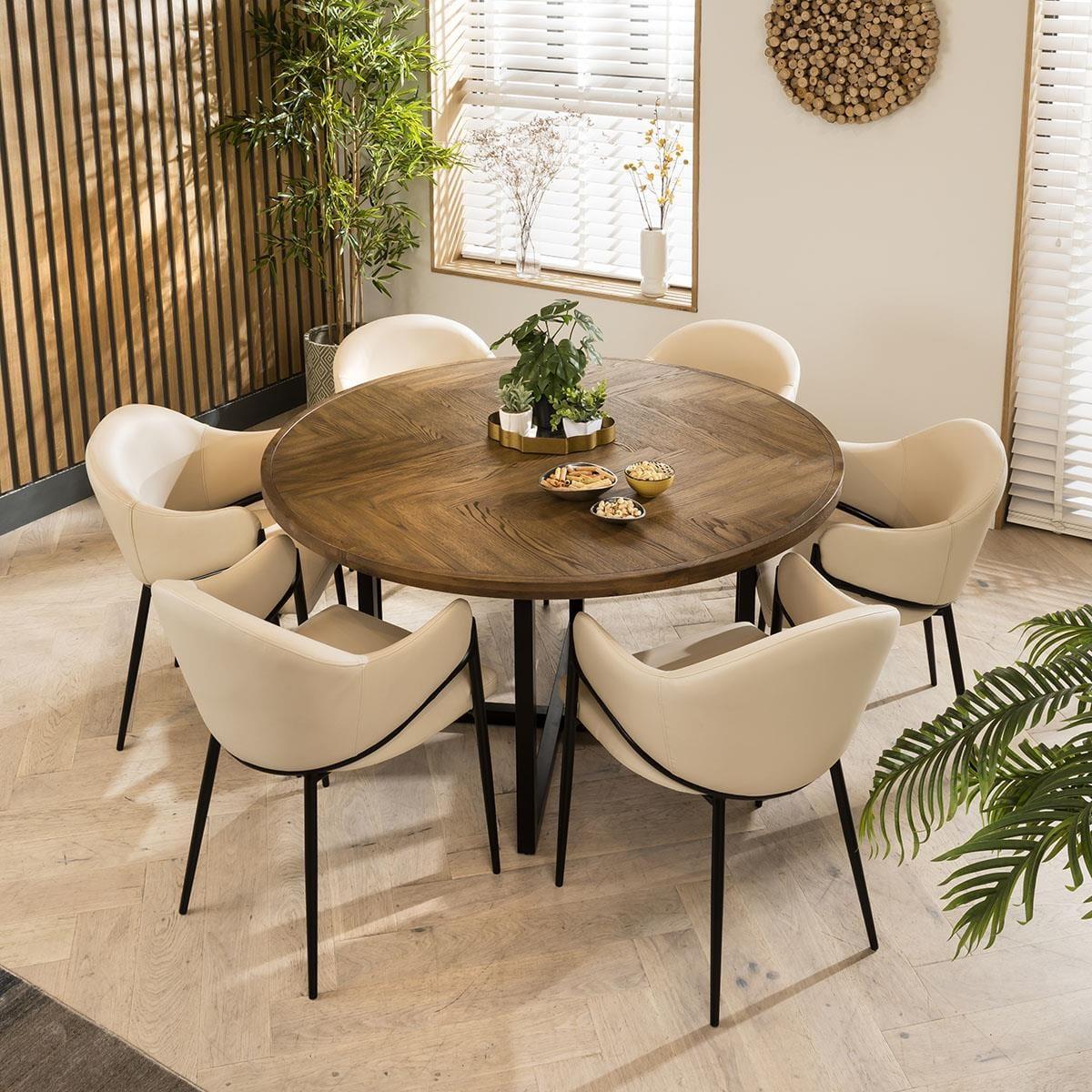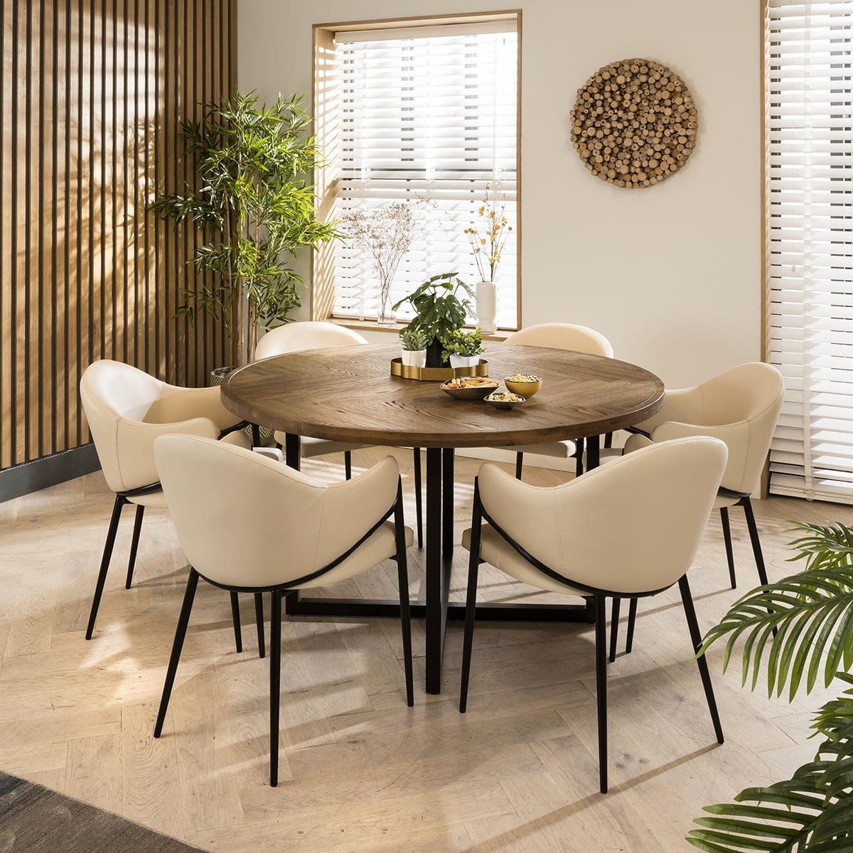 Gather around industrial elegance with our Ashley 6 seater dining table and chairs that effortlessly merge sophistication and style. This modern dining set features a round 140cm herringbone wooden dining table and six chairs that embody designer style, covered in a premium on-trend neutral cream clay faux leather. The modern industrial-style round dining table in this set, a fusion of style and durability. Crafted with solid wood and oak veneer, the circular 140cm table comfortably accommodates 6 seats. The black metal pedestal base supports the round tabletop, featuring an industrial parquet herringbone pattern in a premium stained finish. Our Ashley dining chairs are stylish and comfortable featuring a carver design with arms and a wrap around backrest. The black powder coated metal frame adds durability, while the premium cream clay faux leather upholstery is easy to maintain. This modern dining chair is perfect for adding modern elegance to any dining space. This 6 seater dining set combines modern Ashley chairs with the stunning Gemini table. Whether you love the Ashley chairs and would like to purchase them individually, or you think the Gemini table would complete your interior scheme better with another chair, you can easily mix and match our modern dining tables and chairs to curate something truly unique. Table Size W140cm D140cm H78cm Chair Size W53cm D55cm H81cm Dining Table And Chair Set For 6