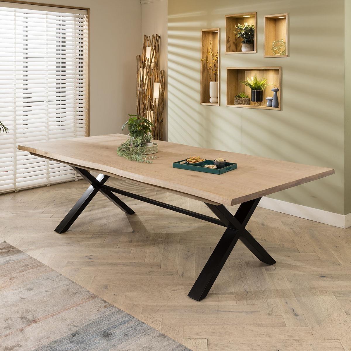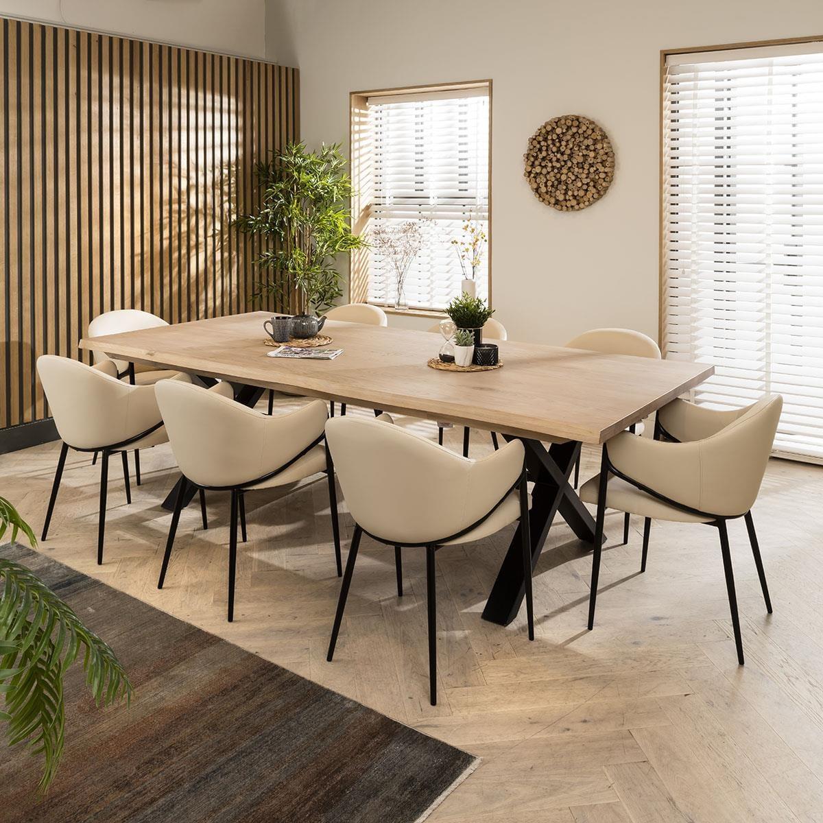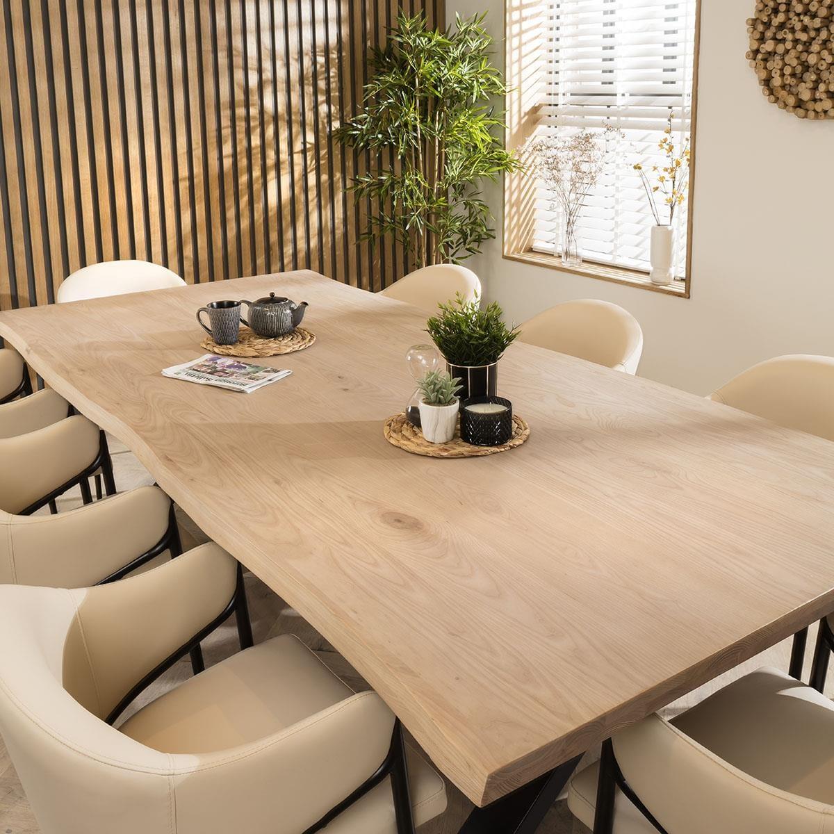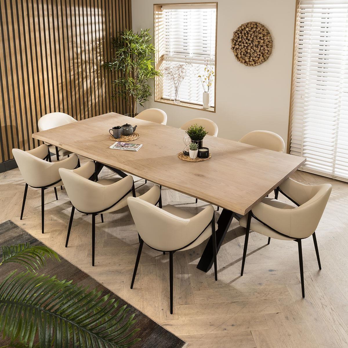 Get the complete designer look with our Ashley 8 seater dining table and chairs that effortlessly merge sophistication and style. This dining set features a large 260cm natural live edge solid wooden dining table and eight chairs that embody modern design, covered in a premium on-trend neutral cream clay faux leather. The Taurus dining table seamlessly blends rustic design with contemporary style in this 8 seater dining set. This large wooden dining table is 260cm, providing ample space for 8 people. Black metal X legs support the tabletop which is crafted from ash wood, with a natural finish and a live edge that showcases the table's inherent beauty. Our Ashley dining chairs are stylish and comfortable featuring a carver design with arms and a wrap around backrest. The black powder coated metal frame adds durability, while the premium cream clay faux leather upholstery is easy to maintain. This modern dining chair is perfect for adding modern elegance to any dining space. This 8 seater dining set combines modern Ashley chairs with the stunning Taurus table. Whether you love the Ashley chairs and would like to purchase them individually, or you think the Taurus table would complete your interior scheme better with another chair, you can easily mix and match our modern dining tables and chairs to curate something truly unique. Table Size W260cm D120cm H76cm Chair Size W53cm D55cm H81cm Dining Table And Chair Set For 8