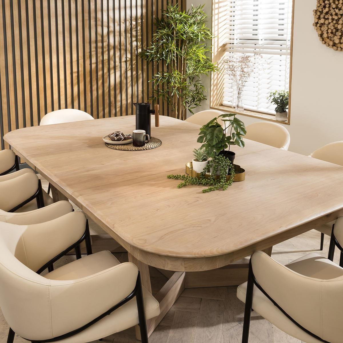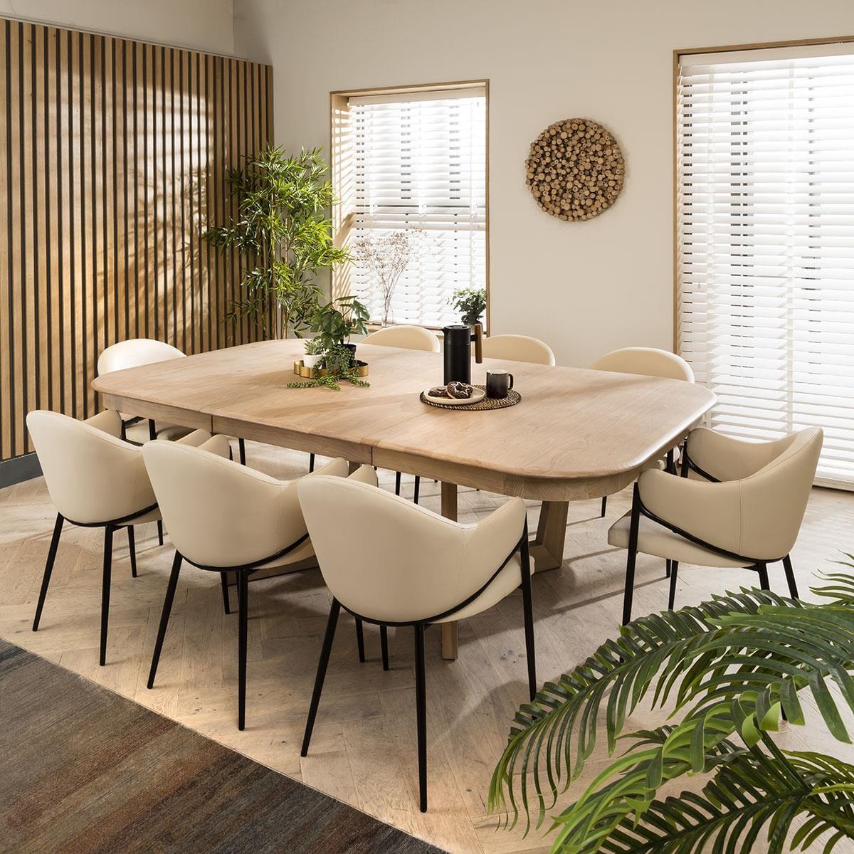 Get the complete designer look with our Ashley 8 seater dining table and chairs that effortlessly merge sophistication and style. This dining set features a large 160-230cm solid extendable wood dining table and eight chairs that embody modern design, covered in a premium on-trend neutral cream clay faux leather. This dining set for 8 includes the Scorpio Extendable Wooden Dining Table with its blend of modern design and rustic farmhouse charm. Crafted from premium ash wood, this kitchen table boasts a natural finish that showcases its timeless appeal. The 8 seater dining room table includes a drop-in leaf, expanding the length from 160cm to a generous 230cm. Our Ashley dining chairs are stylish and comfortable featuring a carver design with arms and a wrap around backrest. The black powder coated metal frame adds durability, while the premium cream clay faux leather upholstery is easy to maintain. This modern dining chair is perfect for adding modern elegance to any dining space. This 8 seater dining set combines modern Ashley chairs with the stunning Scorpio table. Whether you love the Ashley chairs and would like to purchase them individually, or you think the Scorpio table would complete your interior scheme better with another chair, you can easily mix and match our modern dining tables and chairs to curate something truly unique. Table Size W160-230cm D140cm H76cm Chair Size W53cm D55cm H81cm Dining Table And Chair Set For 8