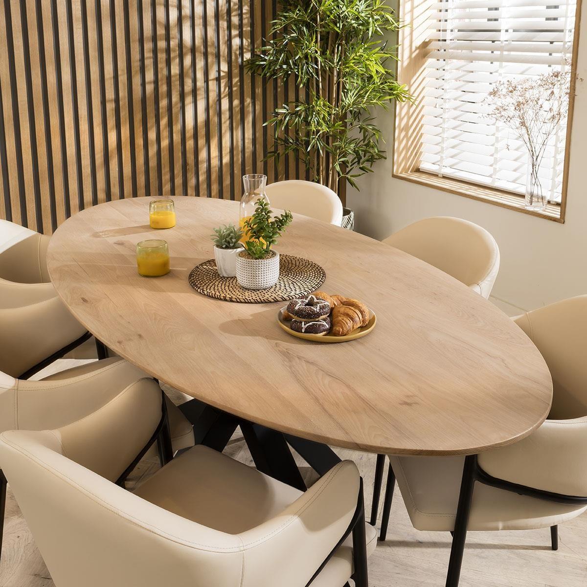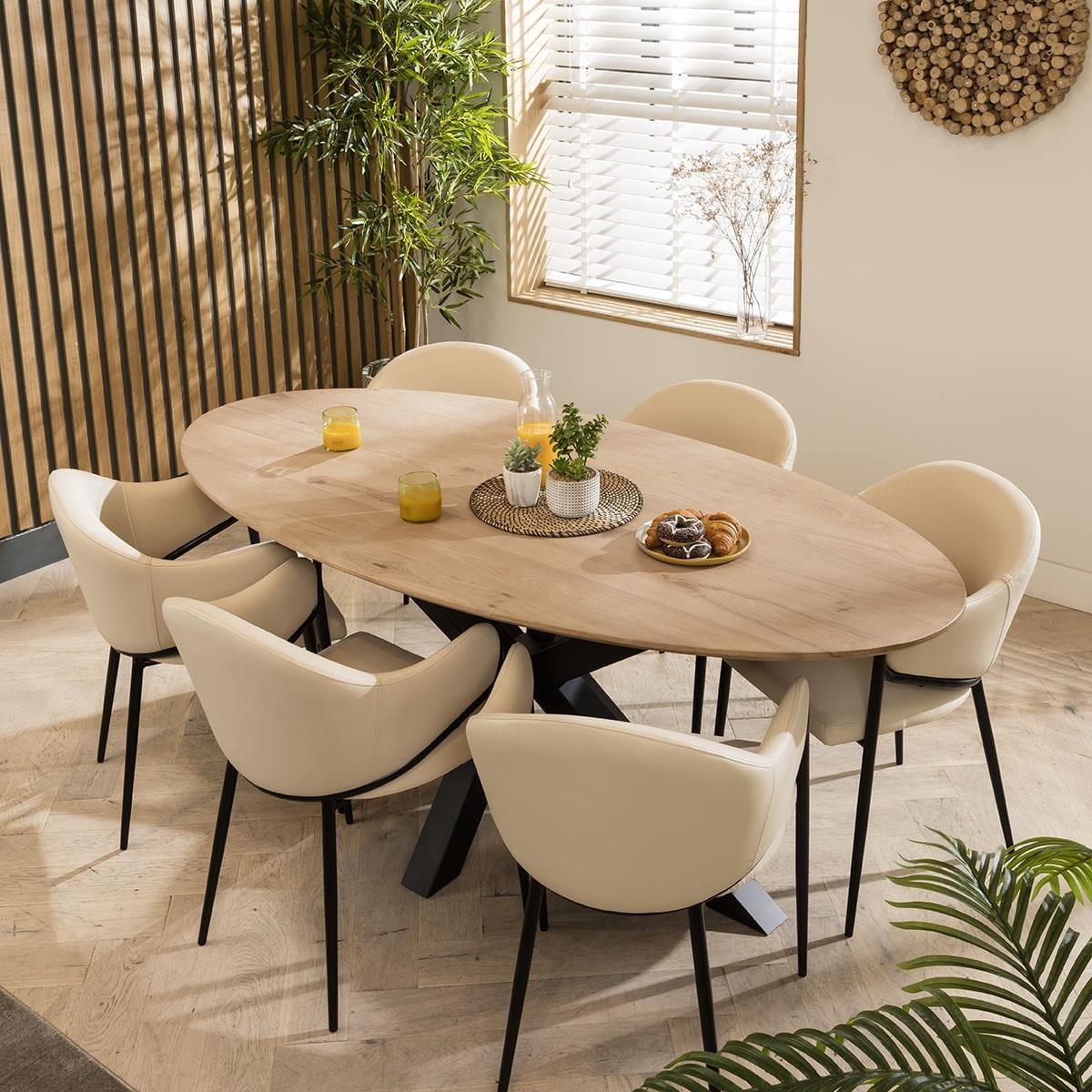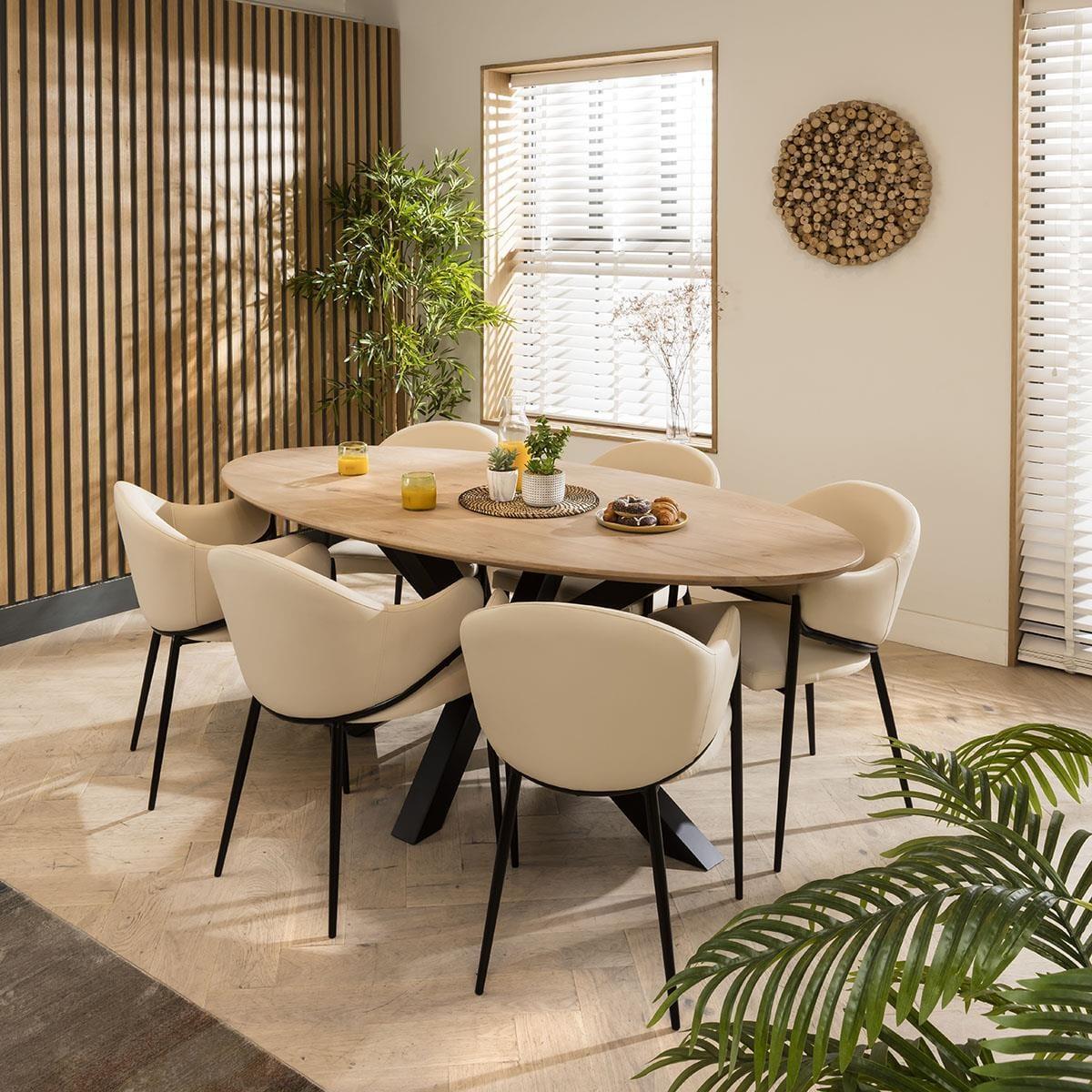 Get the complete designer look with our Ashley 6 seater dining table and chairs that effortlessly merge sophistication and style. This dining set features a large 200cm oval shaped solid wooden dining table and six chairs that embody modern design, covered in a premium on-trend neutral cream clay faux leather. The Aries Dining Table included in this dining set is a masterpiece designed to elevate your dining experience. This industrial inspired 6-seater table boasts an elegant oval shape crafted from solid wood, its natural finish showcases the beauty of the wood. The sleek black wood star spider pedestal base supports the premium oval table top. Our Ashley dining chairs are stylish and comfortable featuring a carver design with arms and a wrap around backrest. The black powder coated metal frame adds durability, while the premium cream clay faux leather upholstery is easy to maintain. This modern dining chair is perfect for adding modern elegance to any dining space. This 6 seater dining set combines modern Ashley chairs with the stunning Aries table. Whether you love the Ashley chairs and would like to purchase them individually, or you think the Aries table would complete your interior scheme better with another chair, you can easily mix and match our modern dining tables and chairs to curate something truly unique. Table Size W200cm D100cm H78cm Chair Size W53cm D55cm H81cm Dining Table And Chair Set For 6