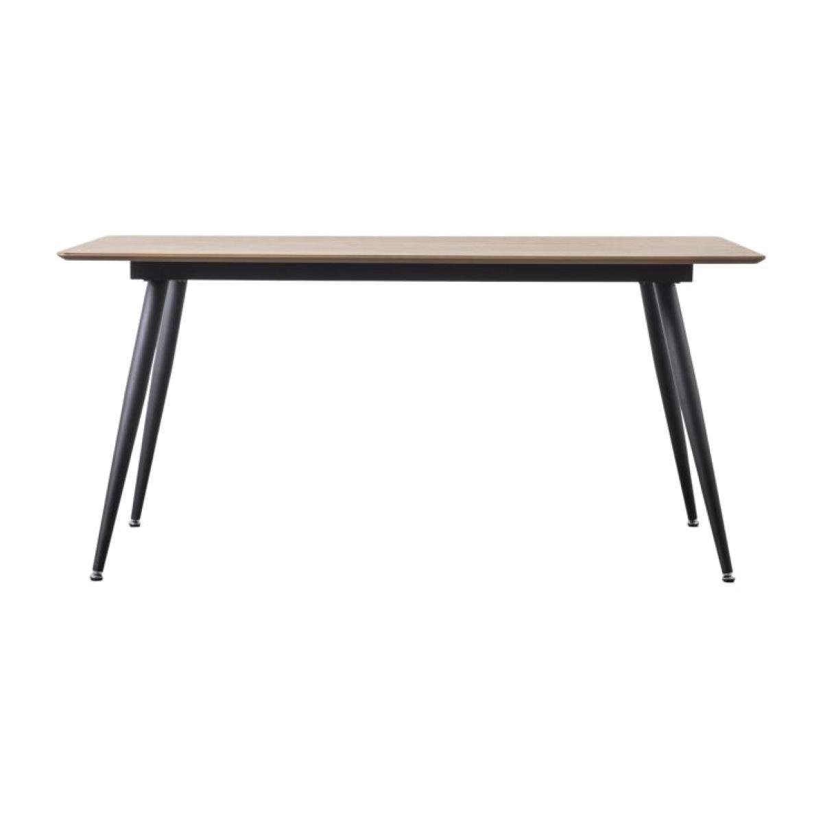 This stunning dining table offers a sleek contemporary look, combining an oak veneer top with elegant black metal legs, whilst chrome feet add the finishing design detail. It is part of our Packed-Flat Design Project which offers easy delivery to any room in any property and reduces the packaging needed. Assembly is required, but all the tools needed are supplied. The table is part of a collection offering a selection of six dining tables, with a choice of a round or a rectangular style, each in three top finishes, black oak, natural oak, and walnut. Material:Oak Veneer. Colour/Finish: Natural. Table Shape: Rectangle.