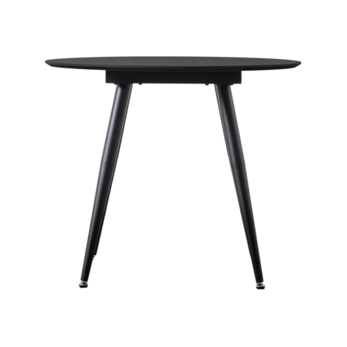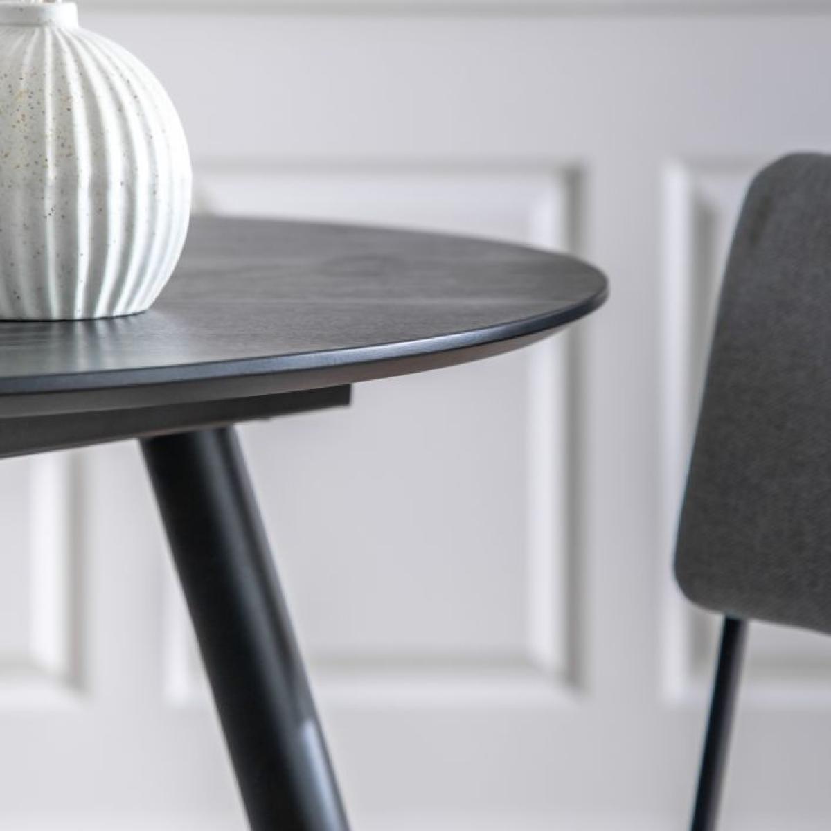 This stunning dining table offers a sleek contemporary look, combining an oak veneer top with a black finish with elegant black metal legs, whilst chrome feet add the finishing design detail. It is part of our Packed-Flat Design Project which offers easy delivery to any room in any property and reduces the packaging needed. Assembly is required, but all the tools needed are supplied. The table is part of a collection offering a selection of six dining tables, with a choice of a round or a rectangular style, each in three top finishes, black oak, natural oak, and walnut. Material:Oak Veneer. Colour/Finish: Black. Table Shape: Round.
