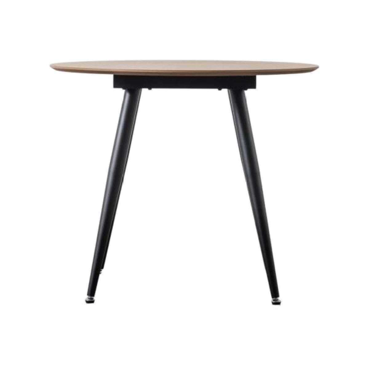 This stunning dining table offers a sleek contemporary look, combining an oak veneer top with elegant black metal legs, whilst chrome feet add the finishing design detail. It is part of our Packed-Flat Design Project which offers easy delivery to any room in any property and reduces the packaging needed. Assembly is required, but all the tools needed are supplied. The table is part of a collection offering a selection of six dining tables, with a choice of a round or a rectangular style, each in three top finishes, black oak, natural oak, and walnut. Material:Oak Veneer. Colour/Finish: Natural. Table Shape: Round.