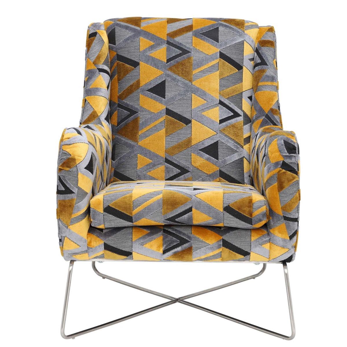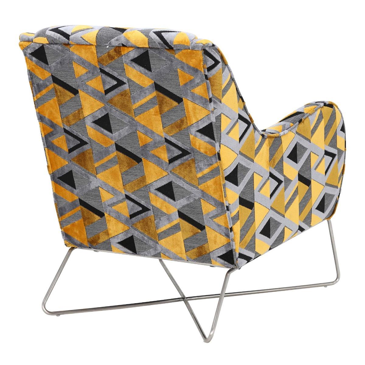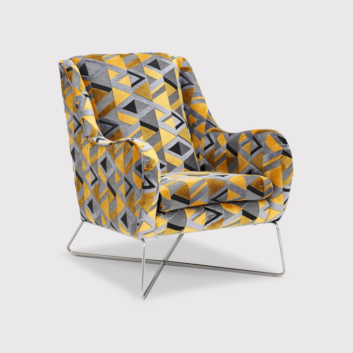 I love the bright yellow on this accent chair-it injects cheerful energy into any space. Its bold geometric pattern makes it an ideal statement piece, especially in modern or contemporary interiors. To style it effectively, consider pairing with neutral or muted tones elsewhere in the room to let the chair stand out, or mix with other yellow accessories for a cohesive look. It works well in social areas like living rooms, or as a pop of colour in a bedroom or home office. Practical tips include balancing its vibrant pattern with simple furnishings and adding some textured cushions or throws to soften the overall aesthetic.