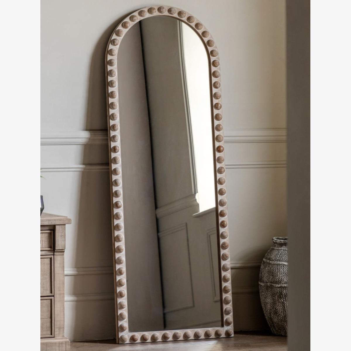 This dramatic leaning mirror with chunky bobbin details in warm toned wood is a real head turner. It’s full height so you can double check your whole outfit and would look just as amazing in a hallway to add light and space as it would a bedroom for all your outfit try-ons. We love how on trend the bobbins are but with a truly classic and enduring appeal.