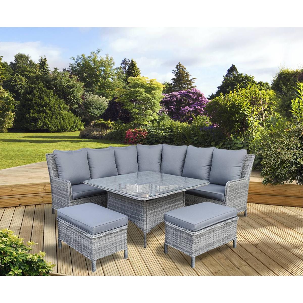 Relax in complete comfort on the Ashwell Corner Set. Brand new to Oldrids & Downtown for Summer 2022, this set consists of a left and right hand facing sofa group, a corner section, two benches and a generous glass-topped table. The sumptuously polyester filled cushions offer maximum comfort when you are relaxing outdoors. The aluminium frame is covered in a modern grey synthetic weave with an intricate border around the arms. Left Sofa: Width 127cm x Depth 77cm x Height 102cm Right Sofa: Width 127cm x Depth 77cm x Height 102cm Corner Section: Width 157cm x Depth 84cm x Height 102cm Table: Width 130cm x Depth 130cm x Height 72cm Bench: Width 80cm x Depth 45cm x Height 48cm Some home assembly is required All screens vary in colour reproduction and whilst every effort has been made to display the colour as accurately as possible it is for guidance only.