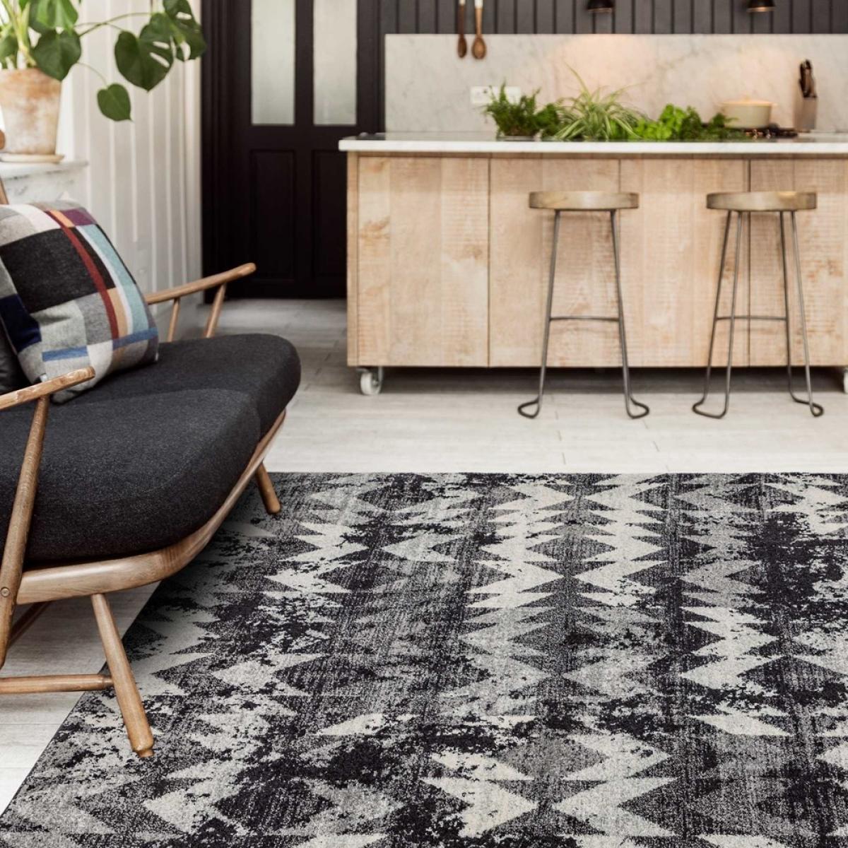 I love this rug because of its bold chevron pattern and contemporary black and grey palette. It’s a versatile piece that can ground both modern and eclectic interiors, working particularly well in open-plan living areas or under dining tables to add visual interest. The geometric design brings structure and energy to a space without overpowering it. For styling tips, consider pairing it with neutral or monochrome furniture to let the pattern stand out, or add textured cushions and throws in complementary tones for a layered look. Its size makes it practical for large living rooms or spacious bedrooms, giving you plenty of room to anchor your furniture and create a cohesive, stylish scheme.