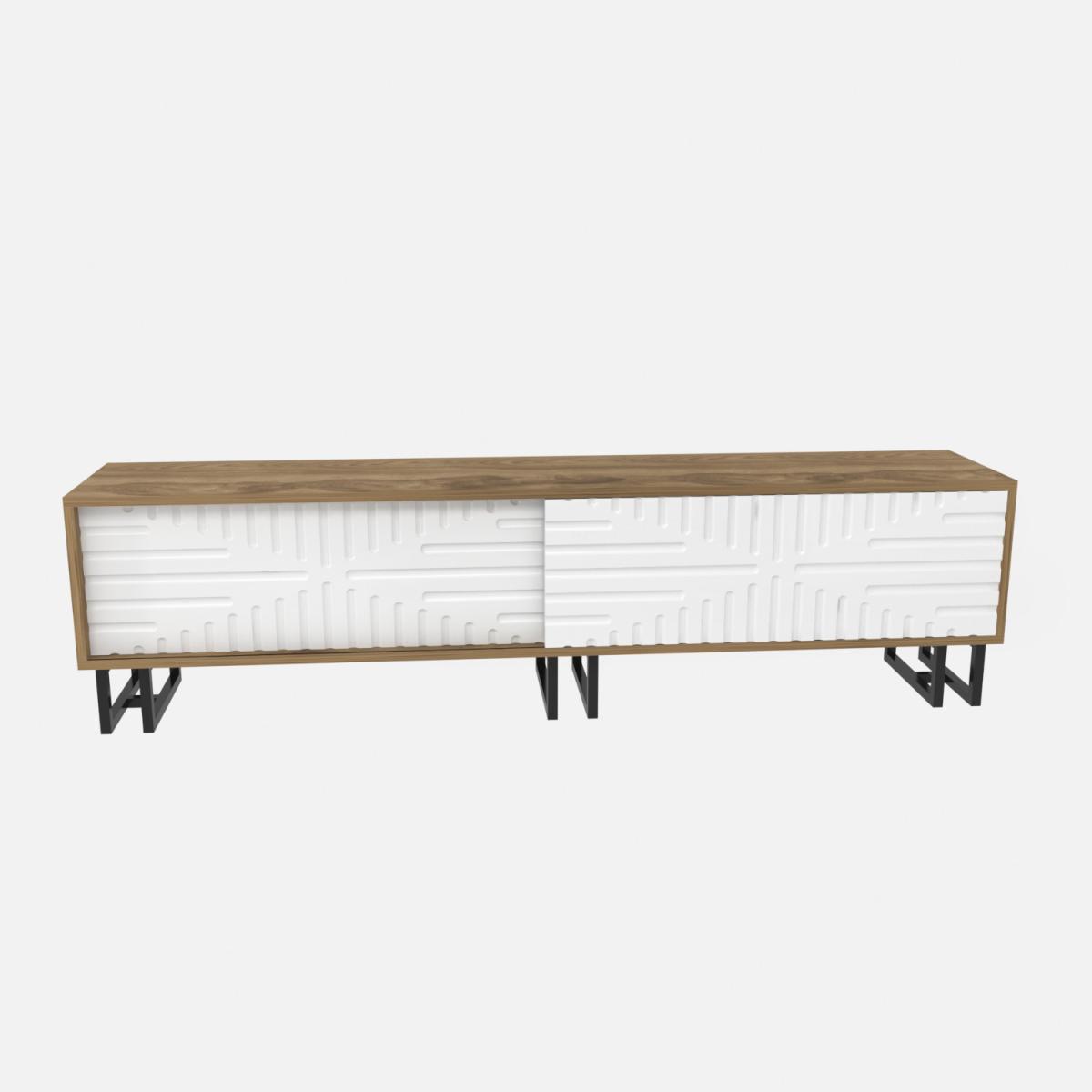 Askal 180 cm TV stand and media console for TVs up to 80" is manufactured to reflect both elegance and quality. A mixture of modernism and geometric design has never looked better. The metal legs and cabinet doors enhance the rich look of the product. One may place the TV on the unit or hang the TV on the wall to earn more space on this beautiful stand. Two large sliding door cabinets will provide you with enough space to store your books, DVDs, CDs etc. It is sure that the TV stand will change the silhouette of your living room. The media stand is made of 18mm thick A quality melamine coated particle board and banded with first-class PVC edge banding tape. Solid plastic legs will protect it from moisture and make it sturdy and durable.