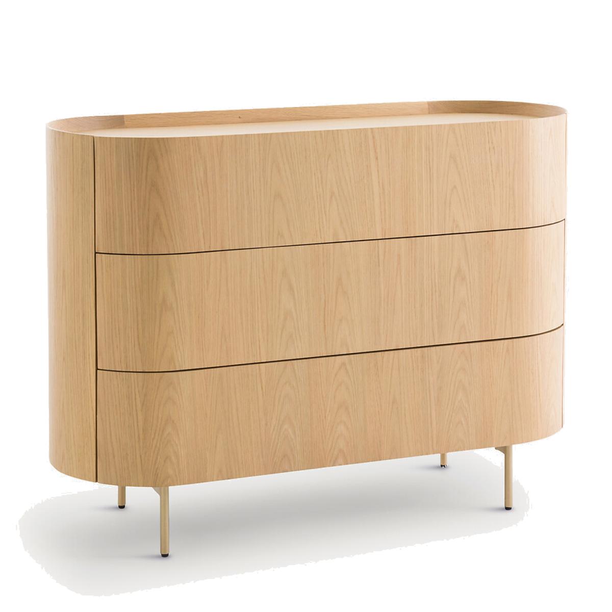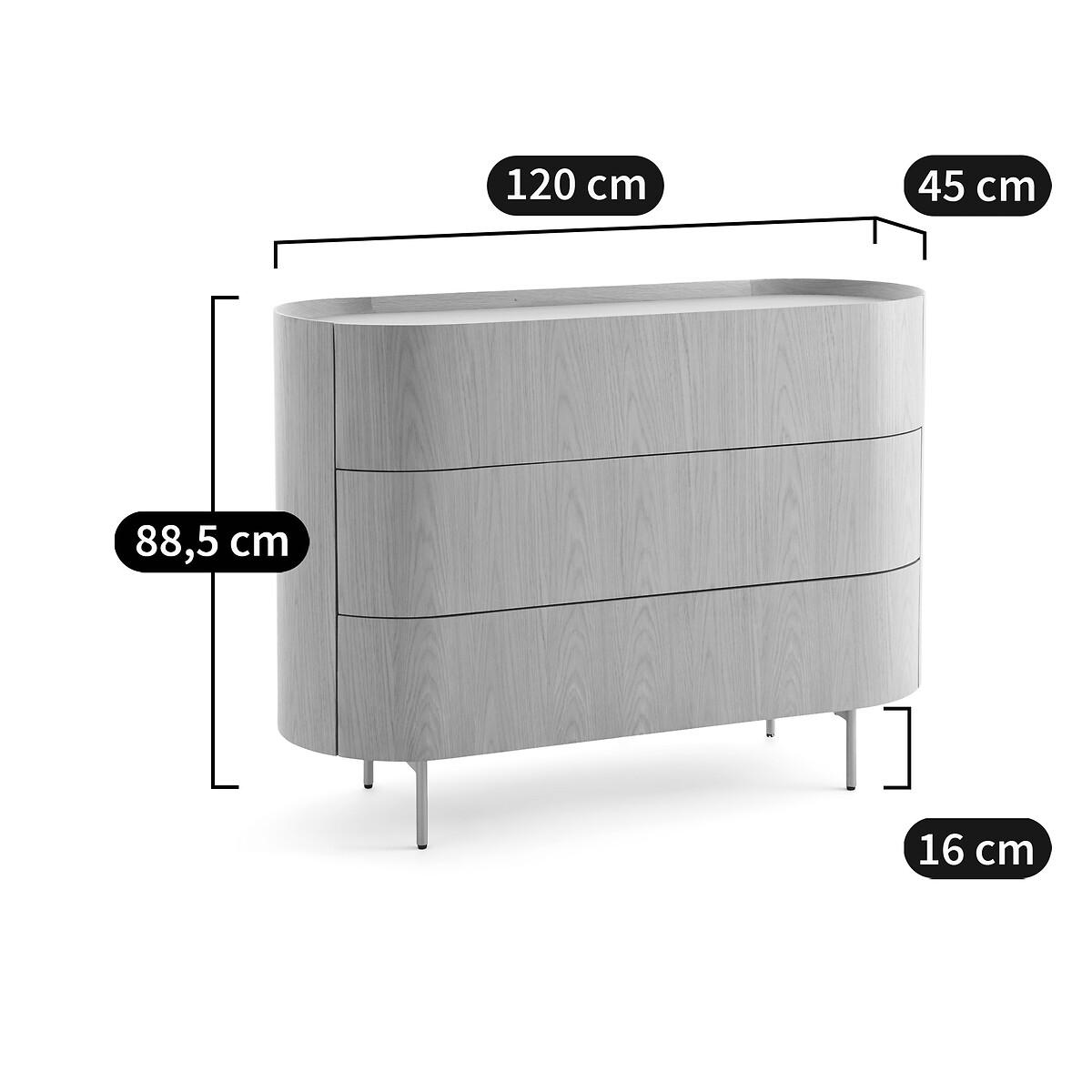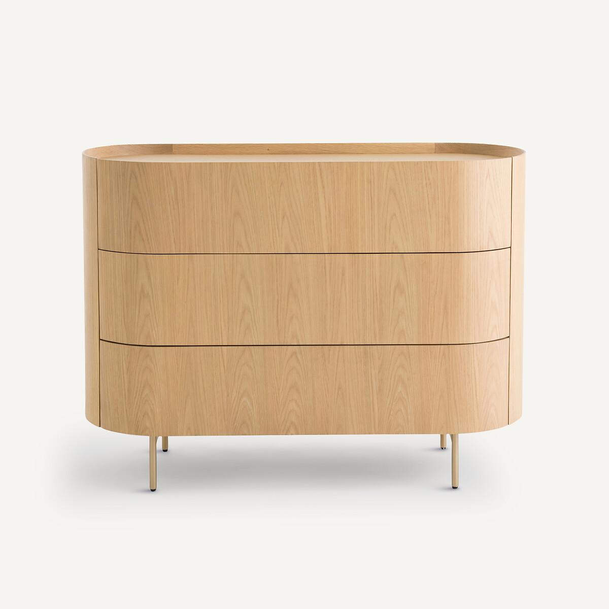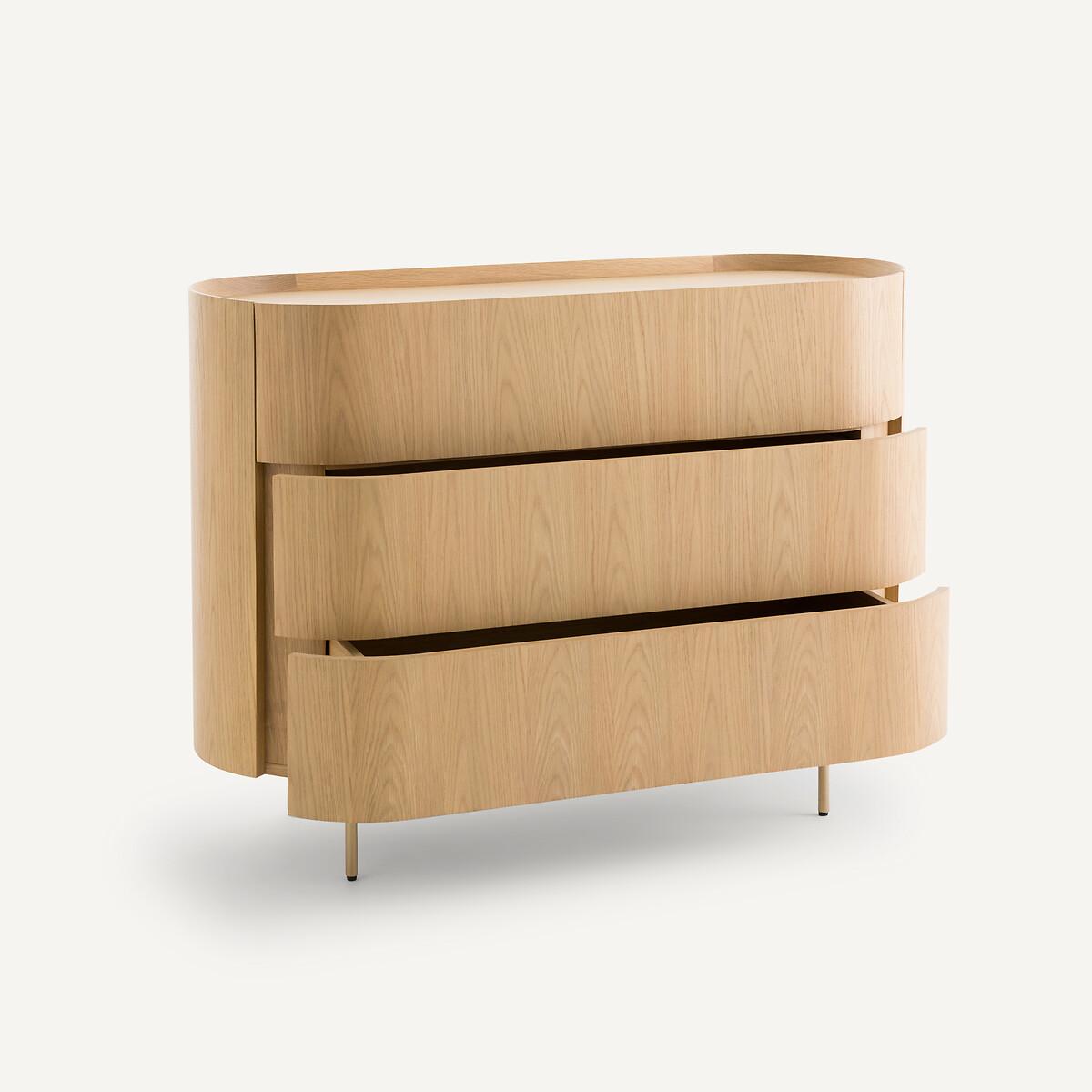 The Aslen solid oak 3-drawer chest of drawers takes up Art Deco codes with curves that soften the volumes. Its sleek base has a lightweight feel. Product Details • Cabinet and drawers in oak veneered MDF with nitrocellulose finish • Top and chamfered edges in solid oak with nitrocellulose finish • Steel legs, polyurethane finish in champagne colour • 3 drawers, the first with a soft closing system. The last 2 push-pull opening / closing. • Adjustable feet. Quality Info • German brand hardware: reliable, discreet and functional. These accessories ensure the longevity of your product. Dimensions. Overall • Width: 120cm • Height: 88.5cm • Depth: 45cm • Base height: 16cm. Usable space • Drawer: L85 x D36cmDelivery:. Sold pre-assembled. Available for home delivery. Note! Please check that all access points are large enough to accommodate your delivery (doors, stairs, lifts). • WOOD FROM SUSTAINABLY MANAGED FORESTS. FSC® certified wood comes from forests that are environmentally, socially and economically well managed. Dimensions and weight of parcel1 parcel • L126 x H96 x D51cm. 75kg.