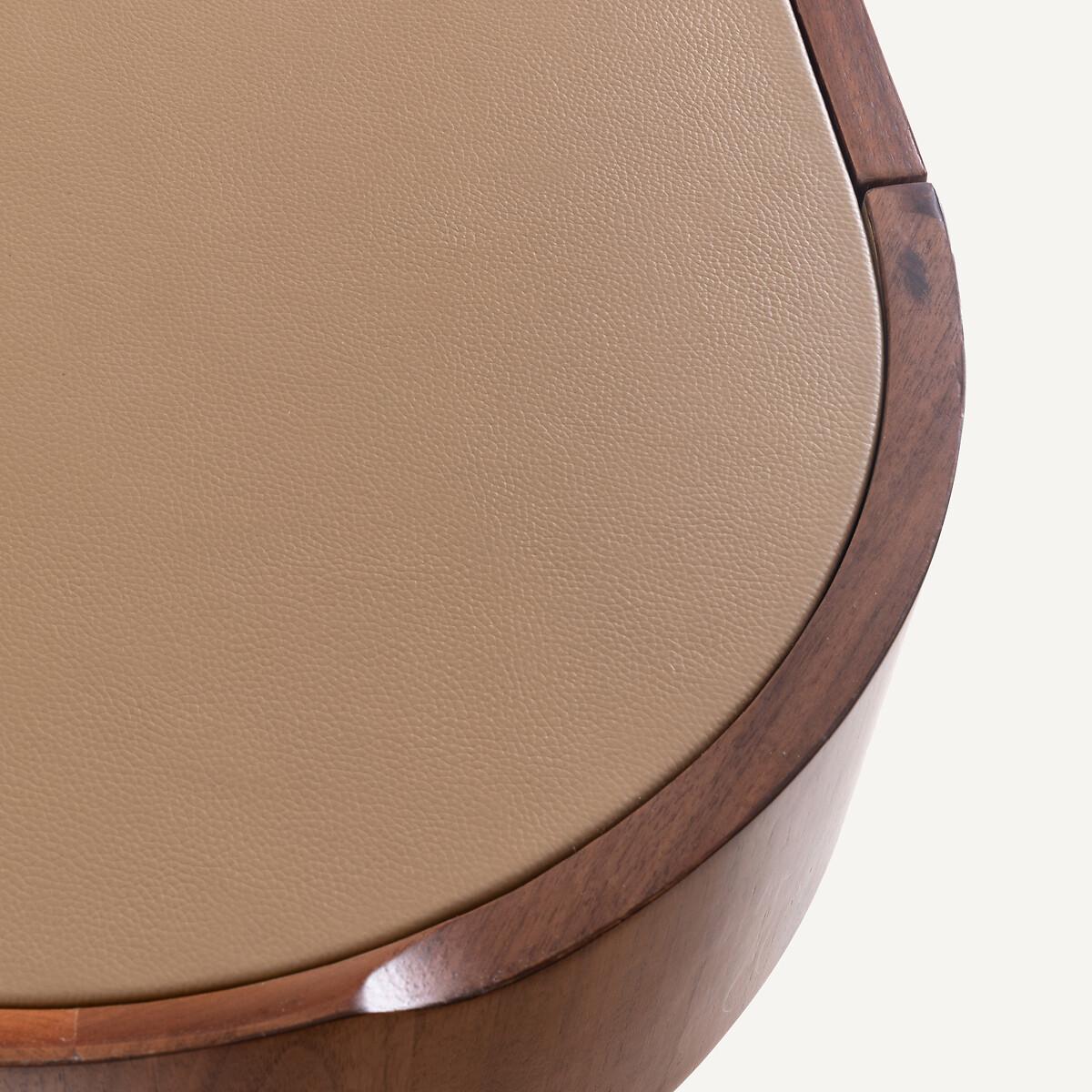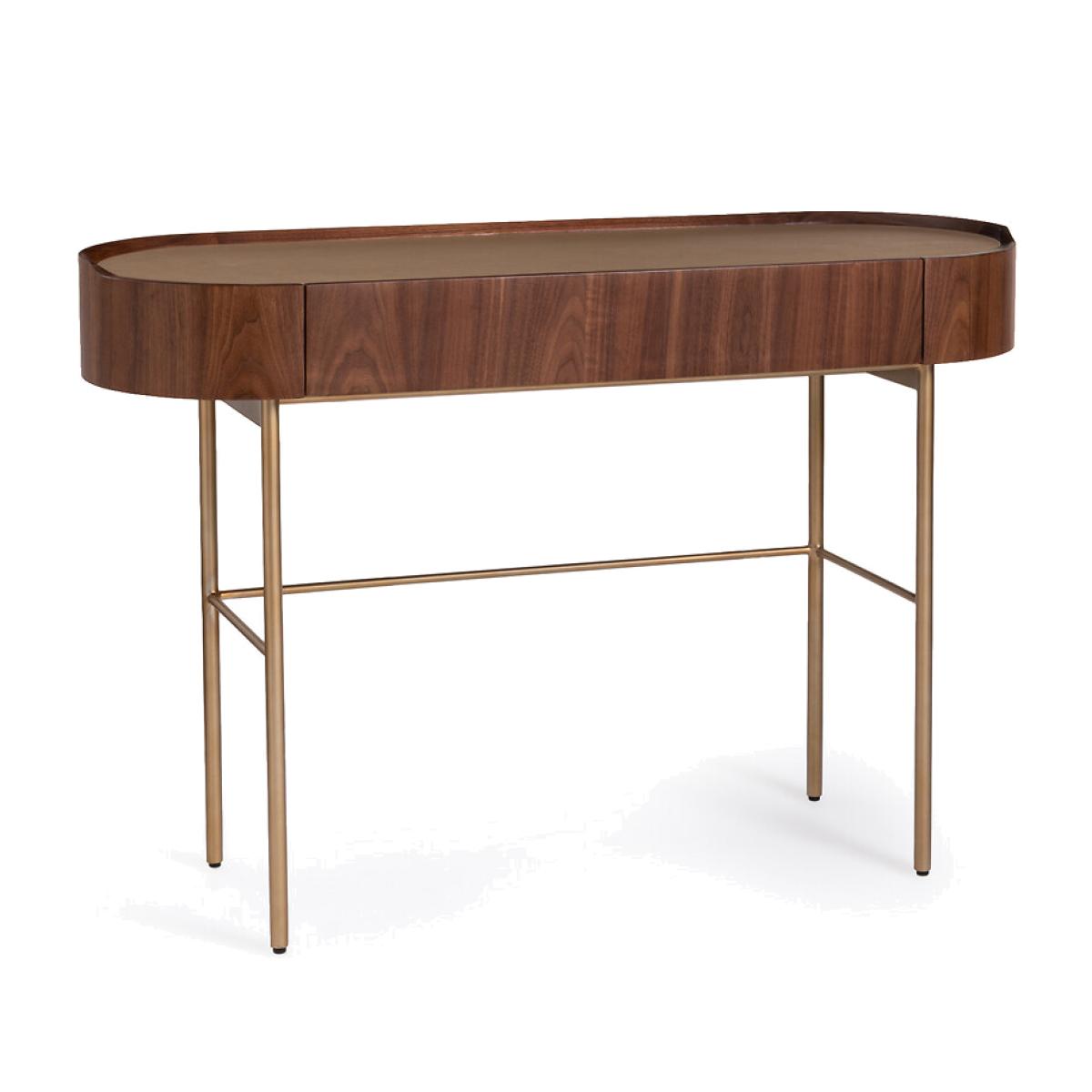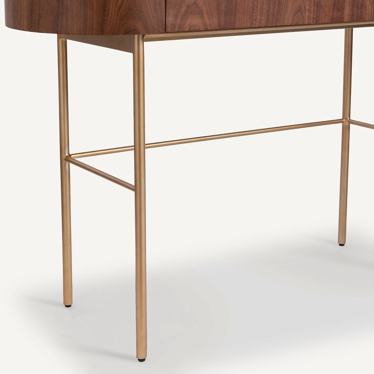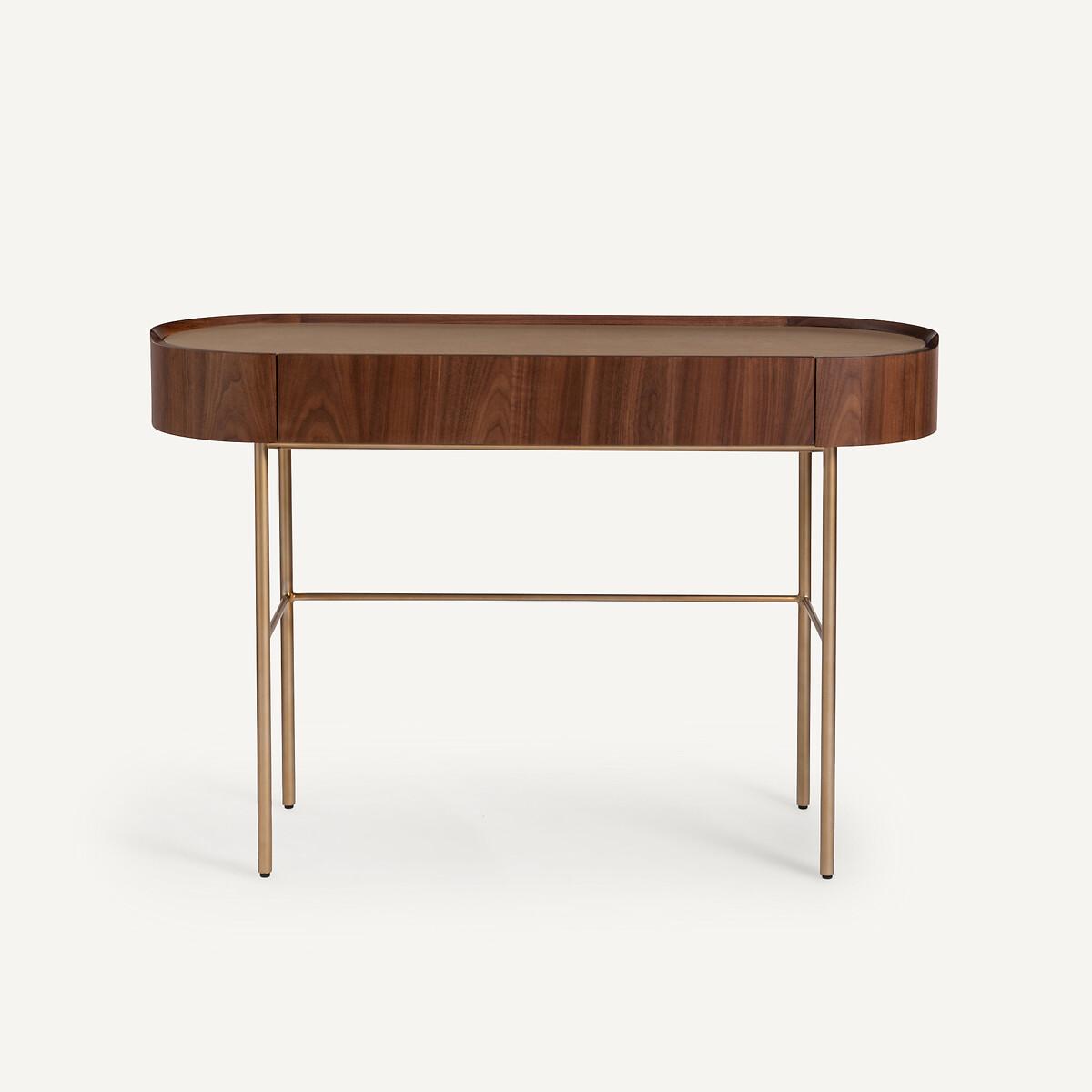 The Aslen console table / desk in walnut and leather has curves inspired by Art Deco design. Its thin base gives a light feel.