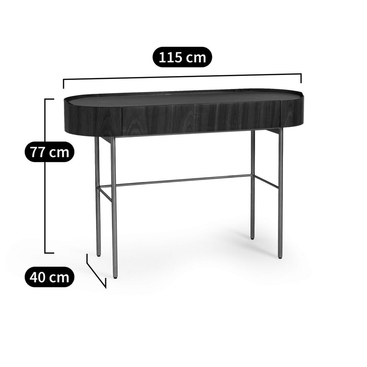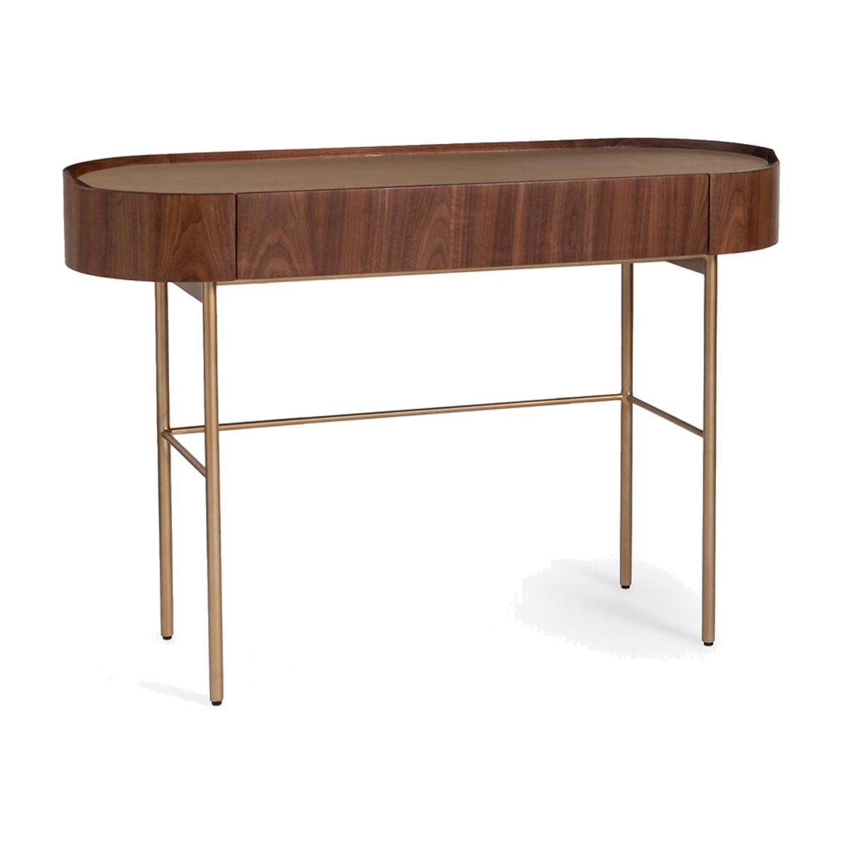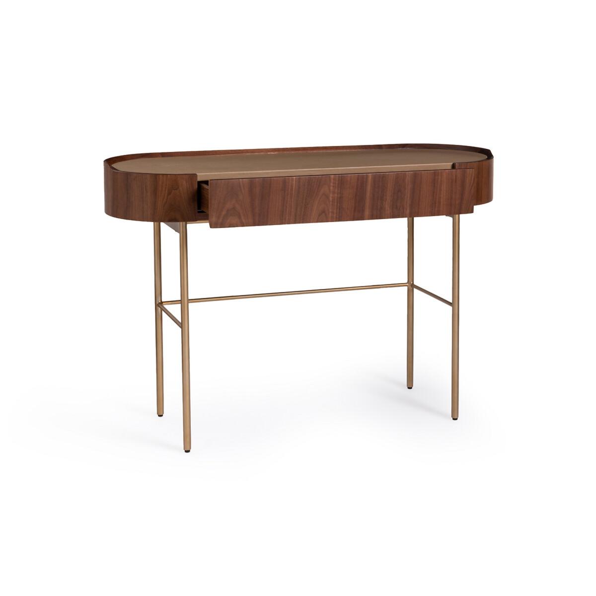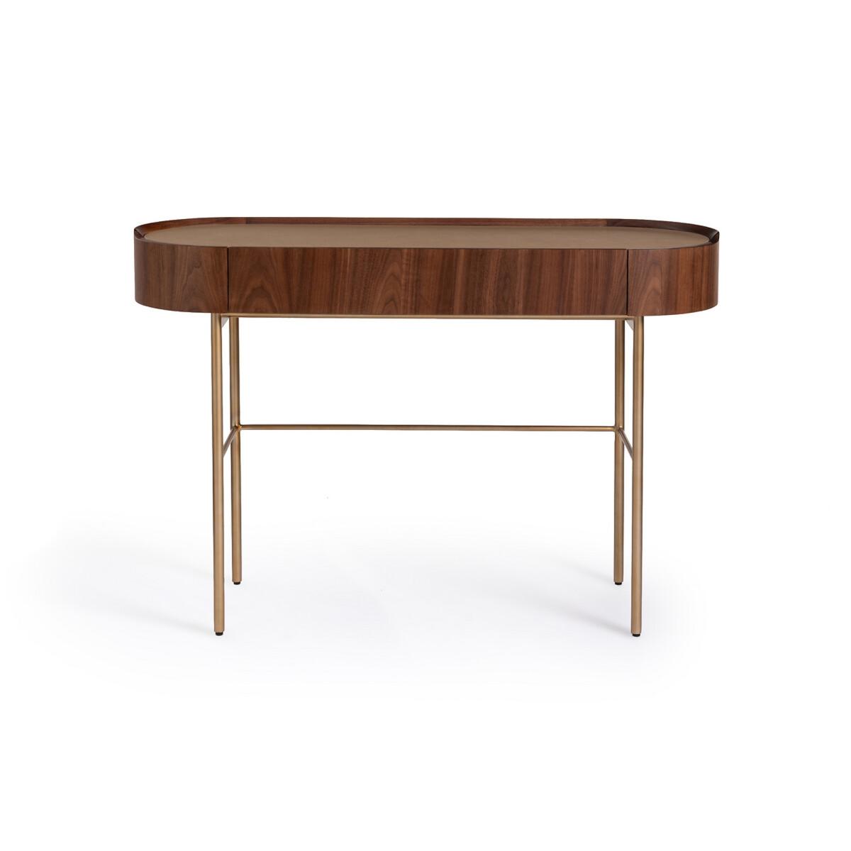 The Aslen console table / desk in walnut and leather has curves inspired by Art Deco design. Its thin base gives a light feel.