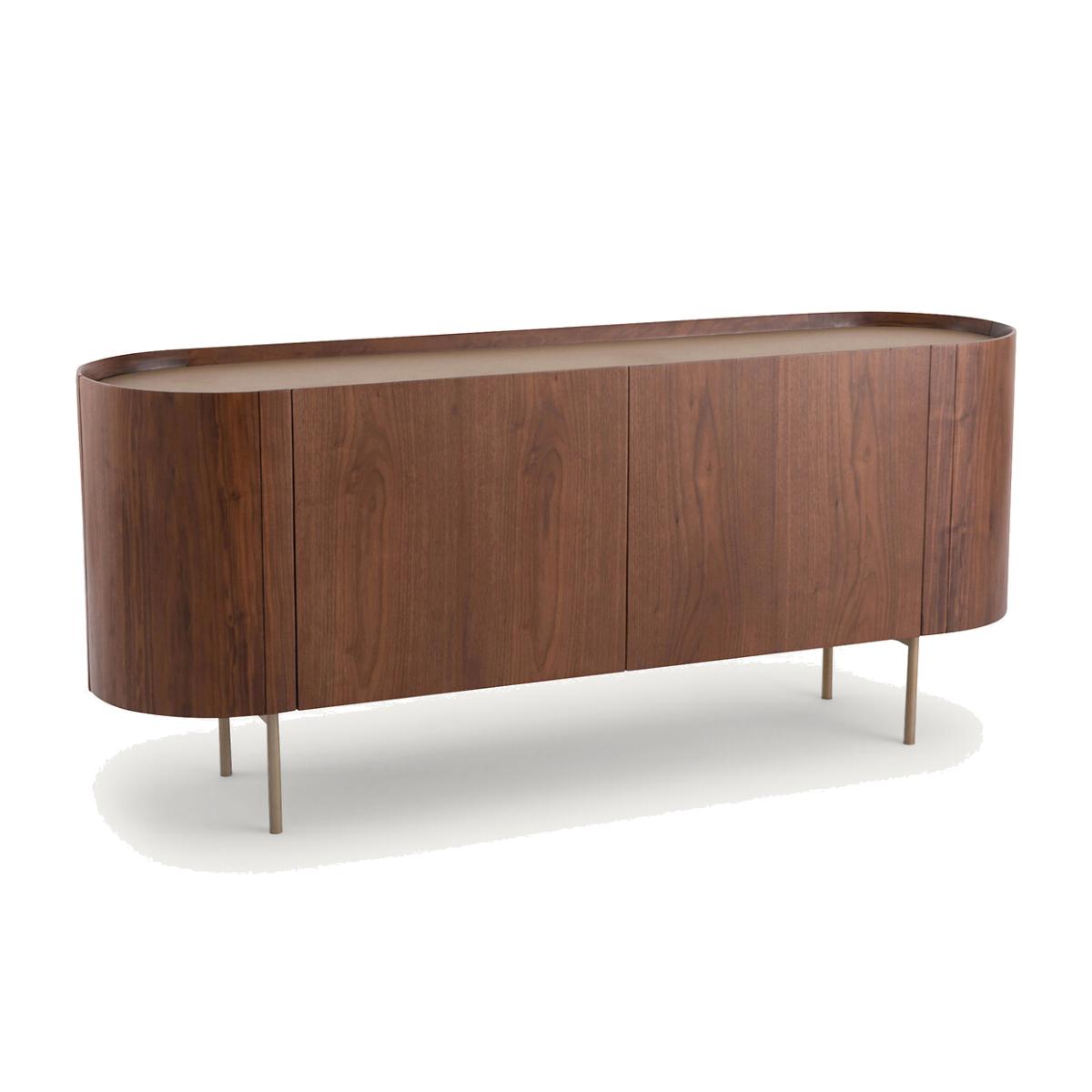 The Aslen walnut and leather sideboard has been inspired by Art Deco design with rounded contours that soften the shape.