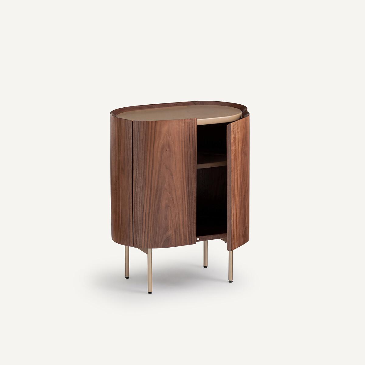 The curves of the walnut and leather Aslen bedside table have been inspired by Art Deco design. Its sleek base has a lightweight feel. Its table top and shelf covered with Italian leather give it a touch of luxury and elegance. Product Details • Walnut veneered MDF cabinet with nitrocellulose finish • Chamfered edges in solid walnut with nitrocellulose finish • Top shelf and shelf covered in genuine leather (cowhide leather, corrected grain, chrome tanning, pigmented finish) • 2 doors, 1 fixed shelf • Steel legs, polyurethane finish, champagne colour • Adjustable feet. Quality Info • German brand hardware: reliable, discreet and functional. These accessories allow easier use of your product. Dimensions. Overall • Width: 50cm • Height: 62cm • Depth: 30cm • Base height: 16cm. Usable space • Shelf: L46 x D26 x H13cmDelivery:. Sold pre-assembled. Available for home delivery. Note! Please check that all access points are large enough to accommodate your delivery (doors, stairs, lifts). • WOOD FROM SUSTAINABLY MANAGED FORESTS. FSC® certified wood comes from forests that are environmentally, socially and economically well managed. Dimensions and weight of package: • L57 x H68 x D36cm • 20kg