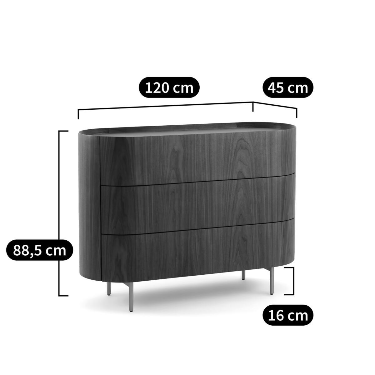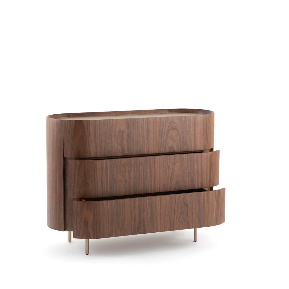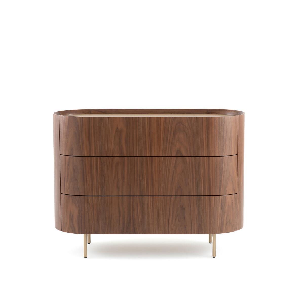 The Aslen 3-drawer chest of drawers in walnut and leather has been inspired by Art Deco design with smooth curves. Its sleek base has a lightweight feel.