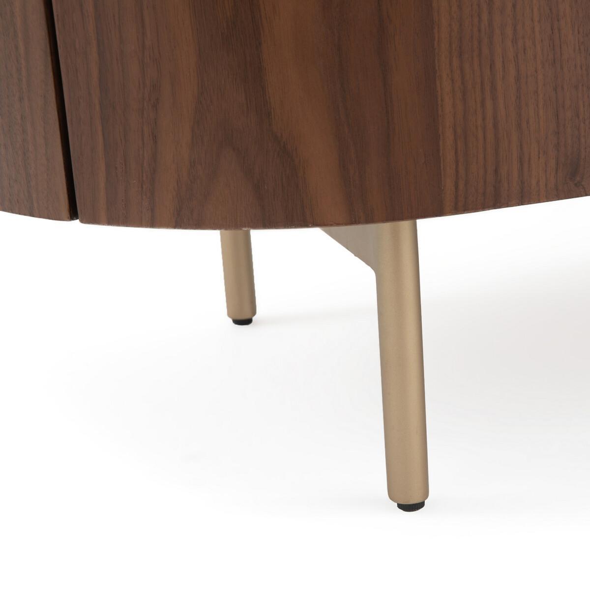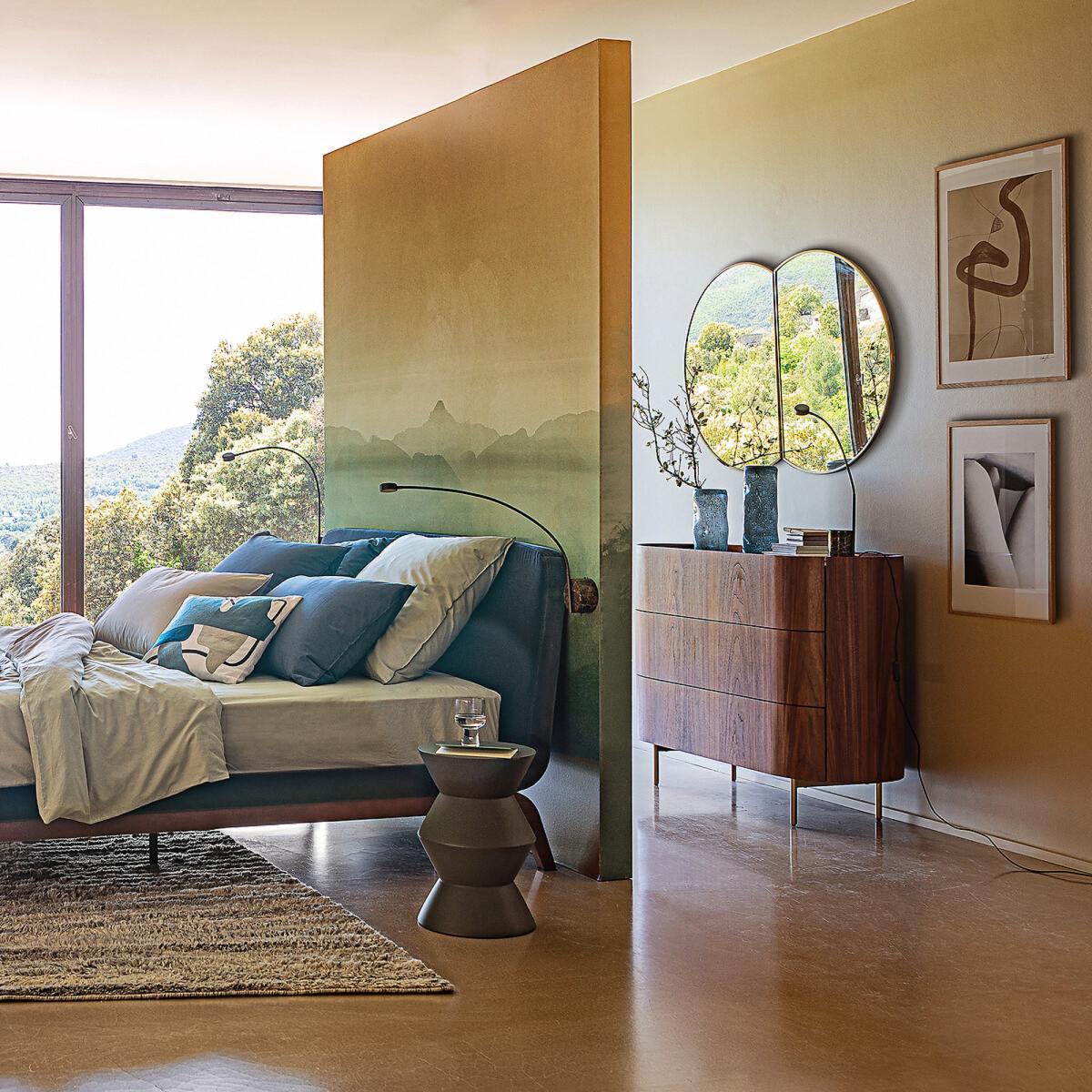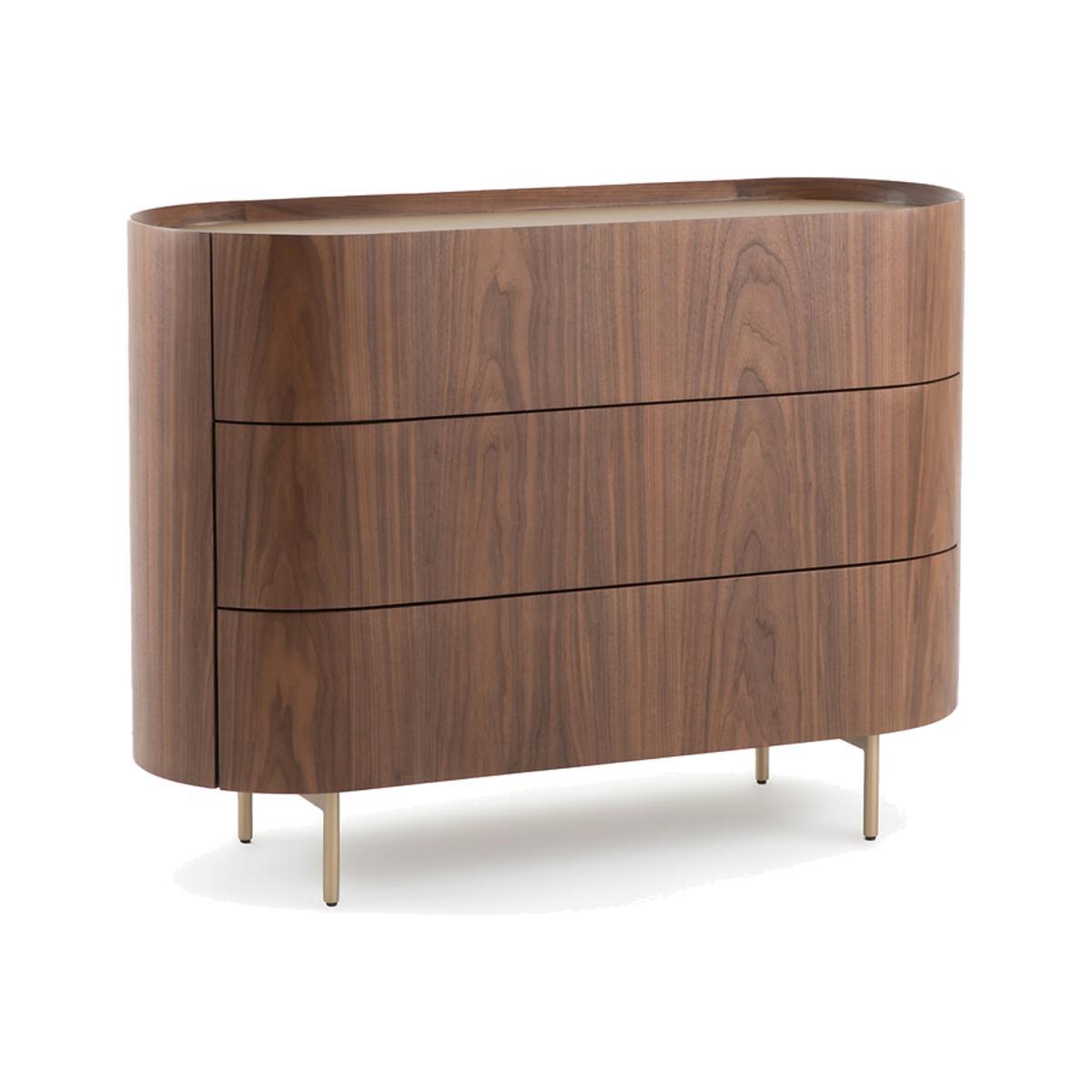 The Aslen 3-drawer chest of drawers in walnut and leather has been inspired by Art Deco design with smooth curves. Its sleek base has a lightweight feel.