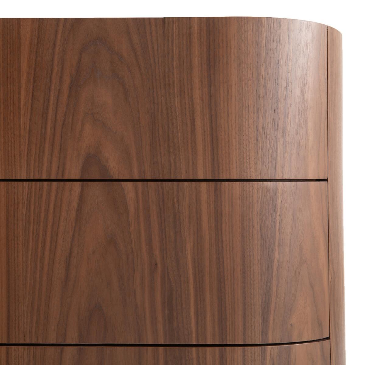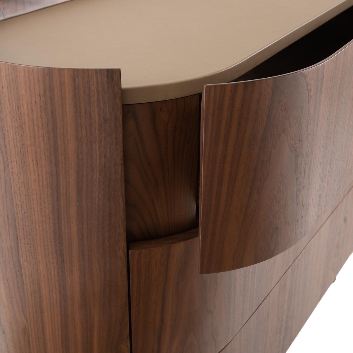 I love this chest for its sleek, modern take on storage with a warm walnut finish and leather accents that add a touch of sophistication. It works particularly well in contemporary and mid-century inspired interiors, where its organic curves and natural materials can really shine. Practical tips include pairing it with minimalist or Scandinavian furniture to keep the look cohesive, or layering it with textured textiles and metal accents for added depth. It's versatile enough to act as a statement piece in the bedroom or a stylish storage option in a living room, making it both functional and aesthetically pleasing.