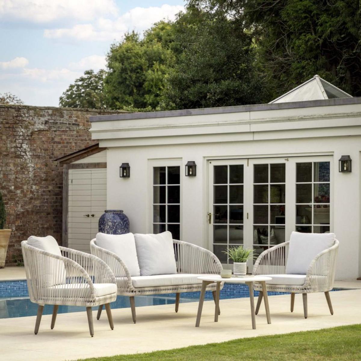 The Aspe Lounge Set includes 2 armchairs, a 2 seater sofa and coordinating coffee table made with wicker, steel and UKFR foam with wooden legs. Modern and light, this lounge set will update your outdoor space with its woven wicker detail and chic turned legs. *Simple Self Assembly *Table Dimensions:W70.5cm x D70.5cm x H45cm *Sofa Dimensions:W143.5cm x D80cm x H78cm *Chair Dimensions:W78cm x D80cm x H78cm *Sofa Seat Height: 43cm *Sofa Seat Width: 130cm *Sofa Seat Depth: 64.5cm *Chair Seat Height: 43cm *Chair Seat Width: 64cm *Chair Seat Depth: 64.5cm *Made From Steel, Wicker, Foam, Acacia, and Fabric