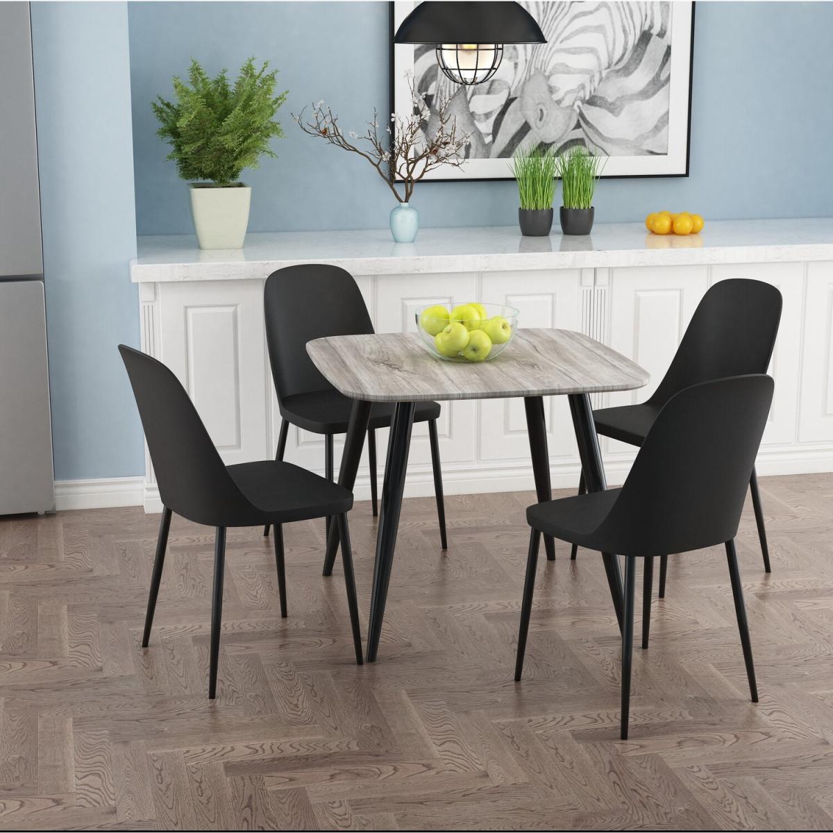 Part of our Aspen casual dining collection this Aspen dining set includes a square dining table and 4 duo plastic chairs. The table has a grey oak effect top and features soft rounded corners and an attractive waterfall edge moulding, avoiding any sharp edges. The underframe is made from steel tubing and the legs are angled and finished in a hardwearing black stove paint. Each leg has an easy to adjust foot, just in case your floor is a little uneven. The duo chairs feature a wraparound seat style for your comfort along with a hardwearing, easy to clean finish. The seat is manufactured from injection moulded plastic with black stove painted tapered legs on a fully welded underframe for strength and stability. The chairs are available in a choice of colours to suit your home decoration and styling. Assembly is straightforward using the tool provided. Maximum chair weight 120kg. Dimensions - Table 80w x 80d x 75h cm Chair 46w x 53.5d x 84h cm