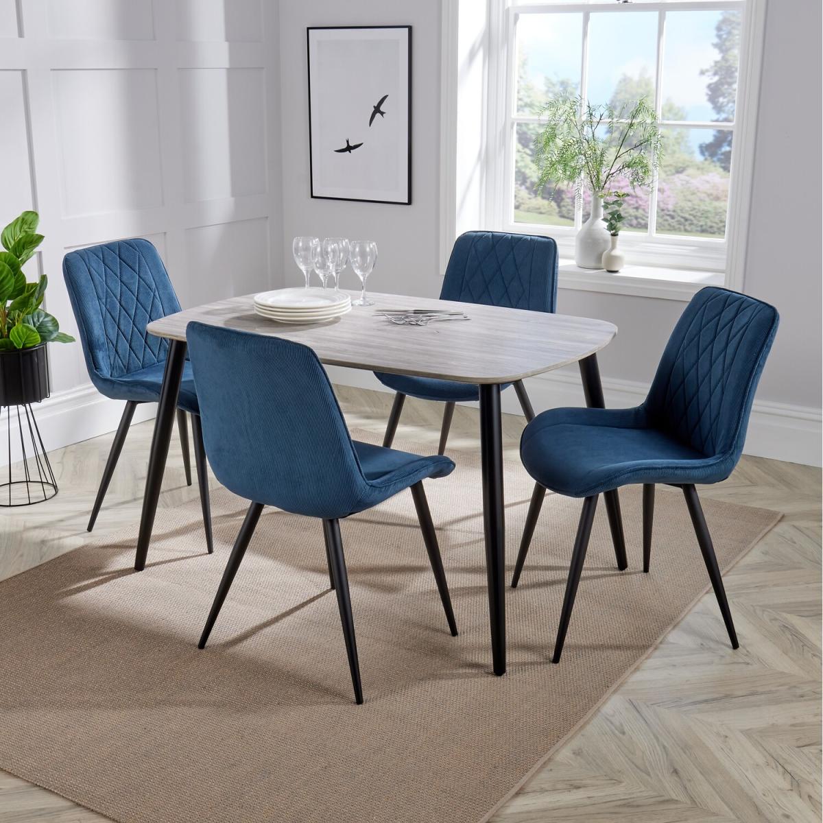 Part of our Aspen casual dining collection this Aspen dining set includes a rectangular dining table and 4 chairs with a diamond stitch design available in a choice of cord or flat weave fabrics. The table has a grey oak effect foiled top and features soft rounded corners and an attractive waterfall edge moulding, avoiding any sharp edges. The underframe is made from steel tubing and the legs are angled and finished in a hardwearing black stove paint. Each leg has an easy to adjust foot, just in case your floor is a little uneven. The chairs are made using a precision plastic moulded seat which is encapsulated in foam and soft fibre filling before the diamond stitched fabric cover is applied. The legs are finished in a black stove paint. The chairs are generously sized and available in a choice of colours to suit your home. Assembly is straightforward using the tool provided, so no need to find any special tools for the job. Chair maximum weight 120kg. Dimensions Table 120w x 80d x 75h cm Chair 54w x 54d x 85.5h cm