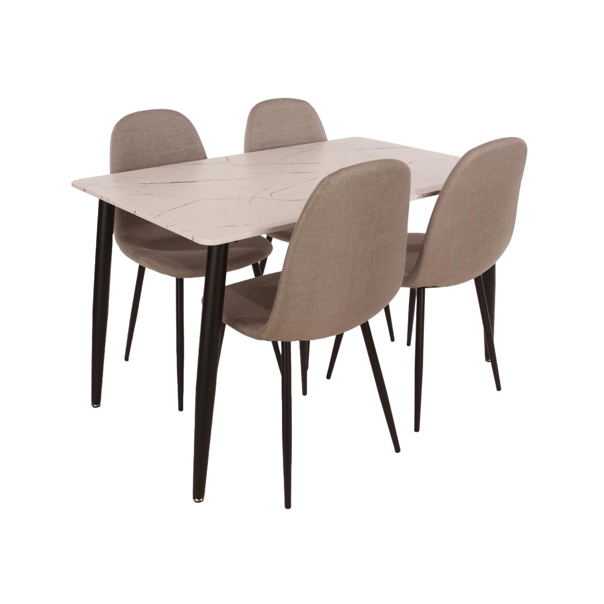Rustic meets modern in the industrial inspired dining set featuring a 120cm x 100cm rectangular table with white marble effect foiled top and four complementing chairs in a stone grey fabric, all with metal legs. Bringing a statement piece to any dining space at great value prices. Easy to assemble, easy to clean and easy on the eye.