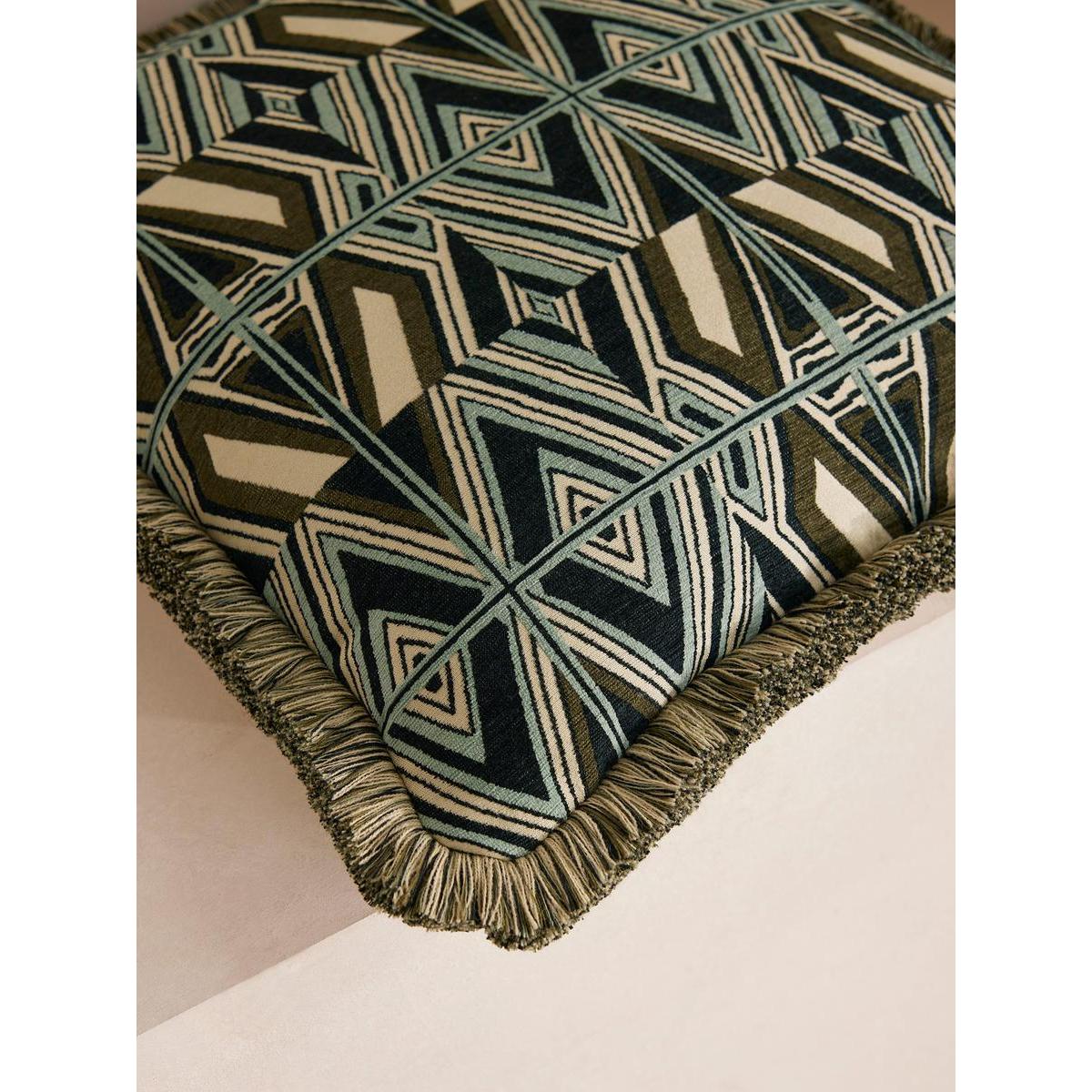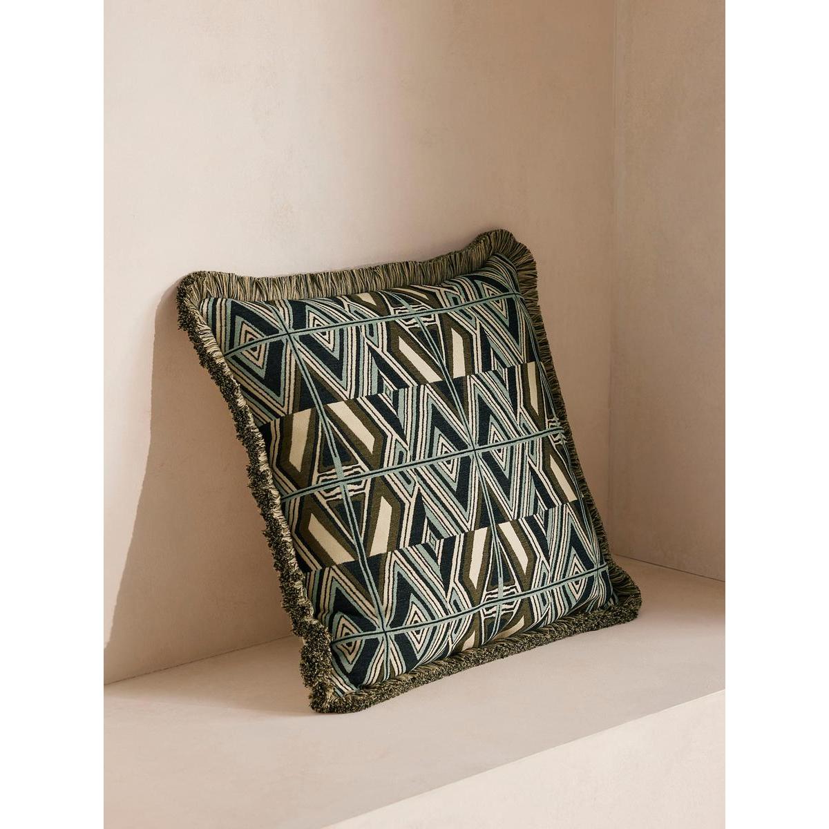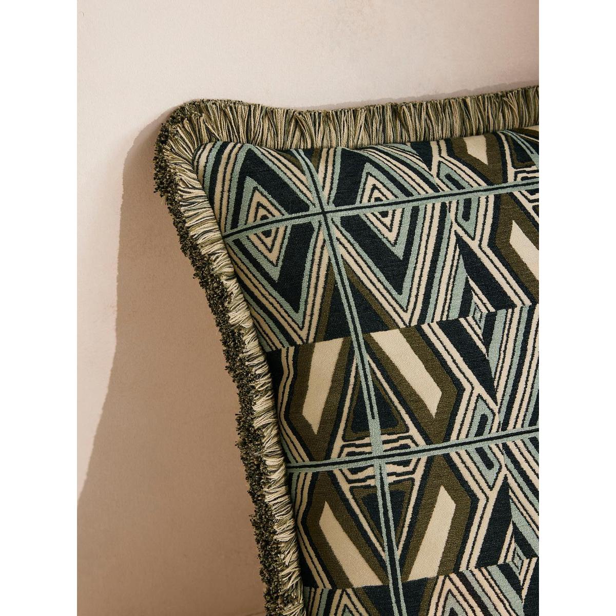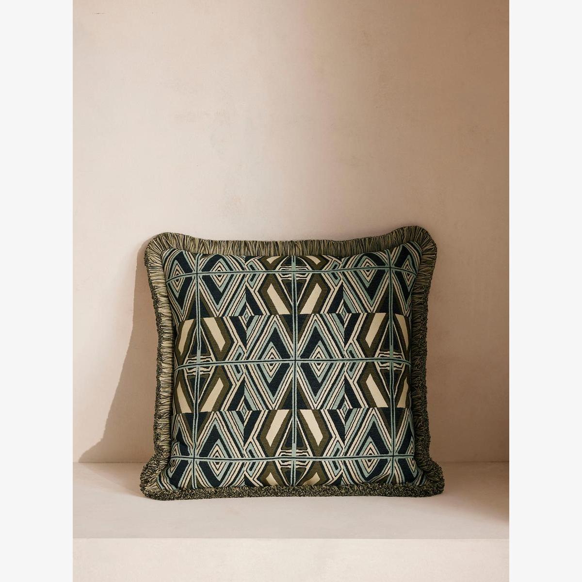 Our in-house design team used bold geometric lines, triangles and zigzags to form our jacquard Allier cushion. Woven in Turkey, it takes influences from the patterns found in Kuba cloths, a traditional African textile, as well as patterns seen in 180 House. Finished with thick eyelash fringing, this cushion perfectly complements our upholstery fabrics for a classic Soho House look.