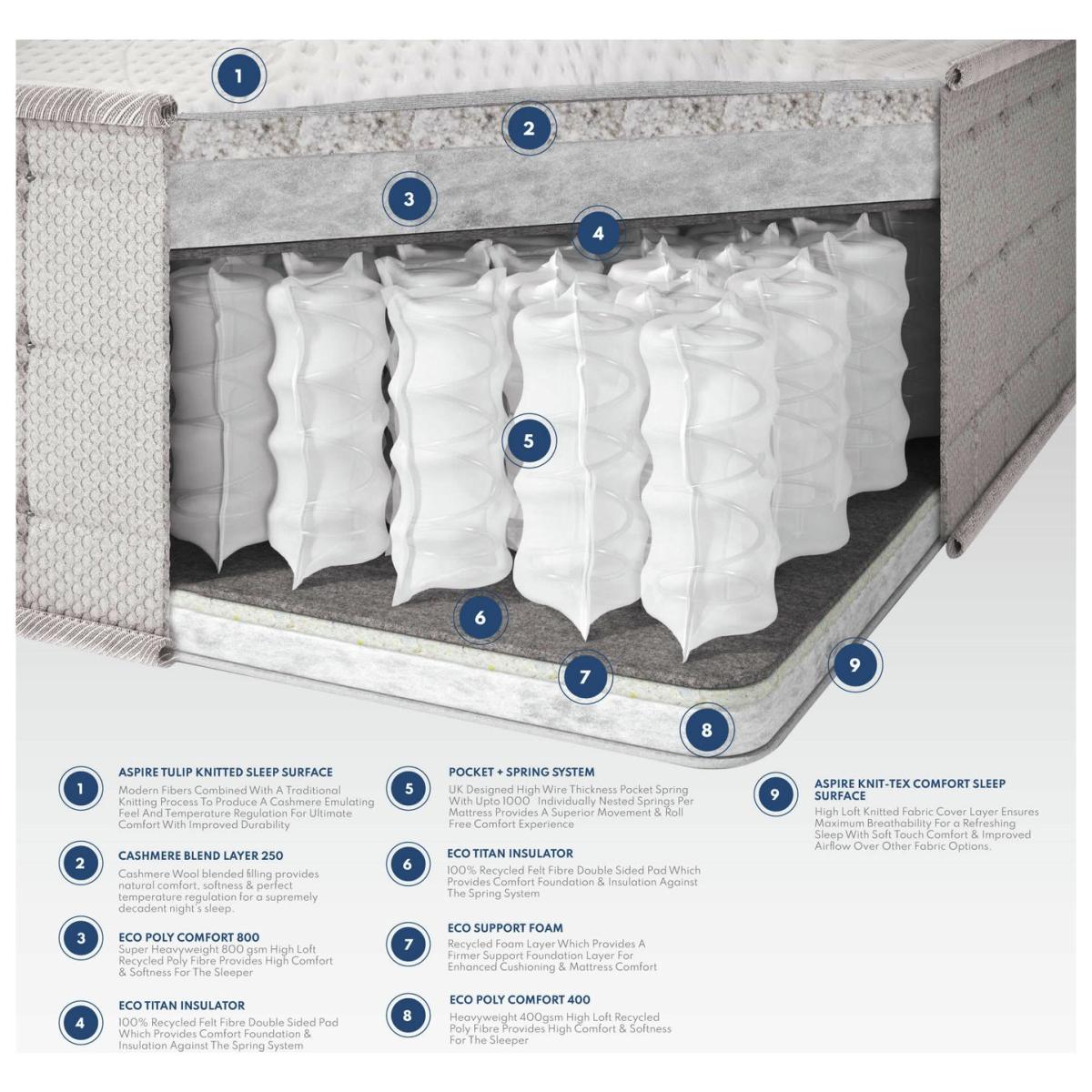 This dual-sided mattress combines luxury and practicality, featuring a 1000 Pocket + spring system for full-body support and motion isolation. One side is finished with breathable cashmere and lambswool for cooler summer sleep, while the other features eco foam for warmth in winter. Medium-firm feel suits most sleepers. Hand-tufted for lasting durability and handmade in the UK, this mattress can be flipped to extend comfort and lifespan. Rolled for easy delivery and setup. Dual-sided design offers breathable cashmere for summer and heat-retaining eco foam for winter. Pocket + spring unit provides superior support and durability, even after rolling. Part of the Aspire collection. Medium firm feel. Pocket sprung mattress with 1000 springs. Knit cover with quilted finish. No roll together. Anti allergy. Mattress size W90, L190, D23cm. Mattress Weight 20.8kg. Rotate mattress regularly. Made in the UK. Rolled mattress. Package Dimensions: Package 1 dimensions: H98, W35, D30cm. Package 1 weight: 21.72kg. General information: Manufacturer's 5 year guarantee.