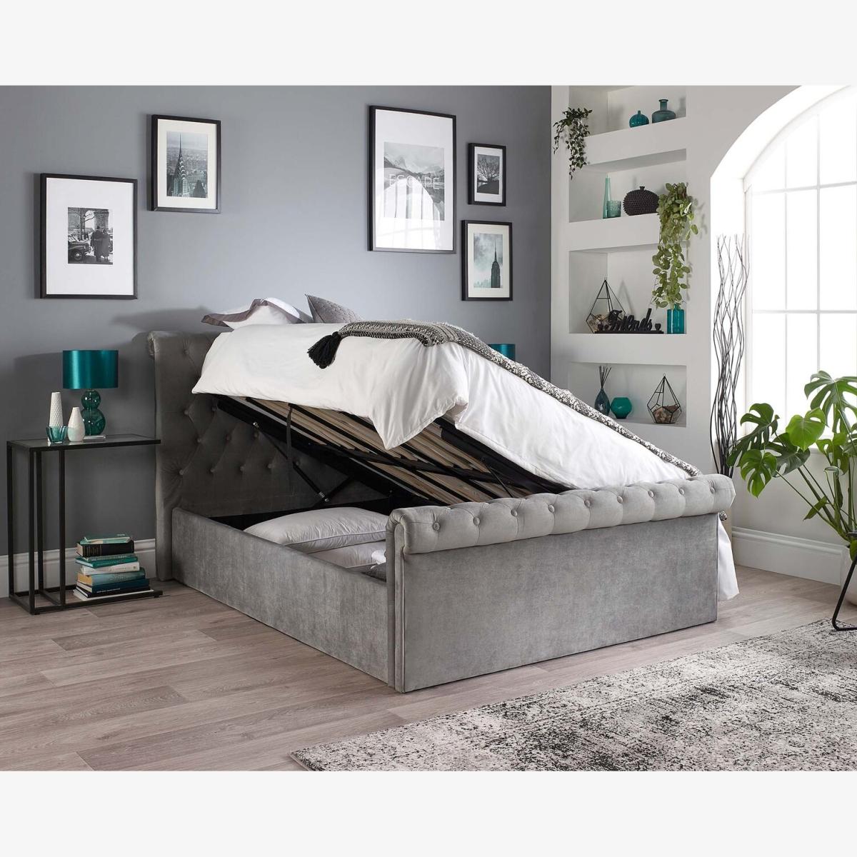 Aspire side lift chesterfield ottoman bed in double size upholstered in a silver brushed velvet finish. Scroll top ottoman bed that can be set to open from the left or right hand side.