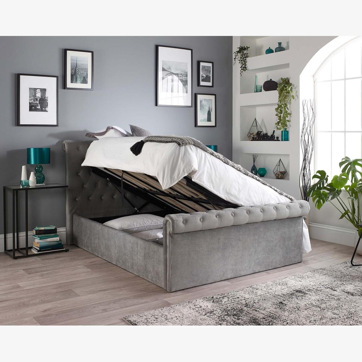 Aspire side lift chesterfield ottoman bed in small double size upholstered in a silver brushed velvet finish. Scroll top ottoman bed that can be set to open from the left or right hand side.