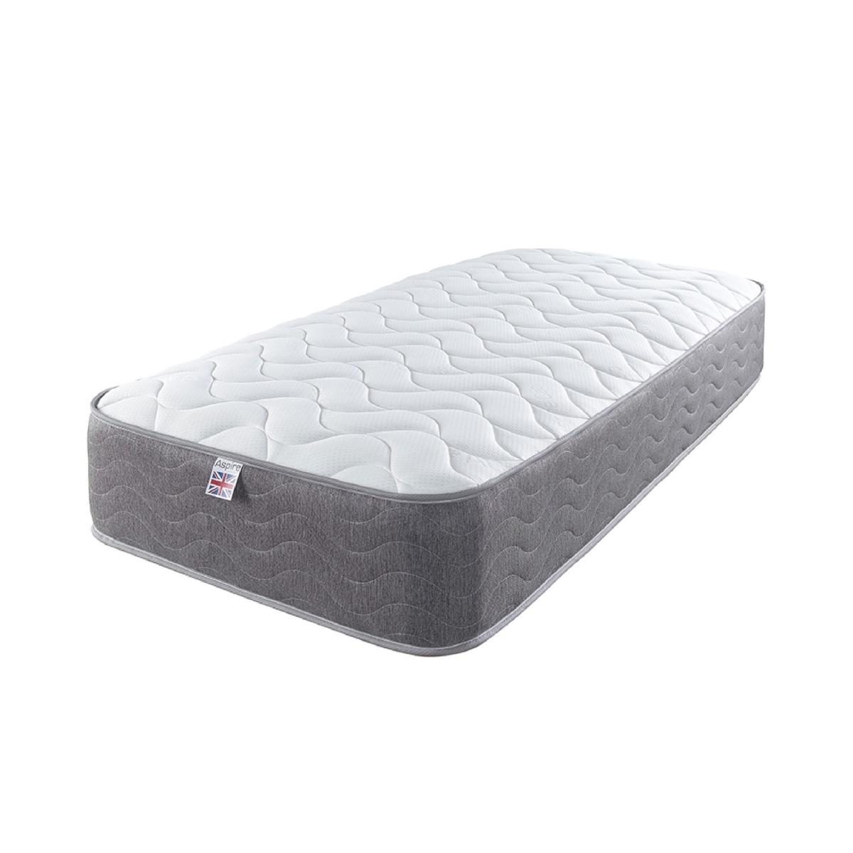 Dimensions H19 x W90 x D190cm Features. Mattress Firmness Medium/firm feel. Hybrid Coil Sprung and; Eco Foam Finish Quilted Surface Cool Touch Sleep Surface Unique 3 Layer Comfort Construction12 Month Guarantee Double Comfort Cool Relief Hybrid Memory Foam and; Spring Mattress This 20.5 Cms Deep Bonnell Spring Mattress Features A Premium Spring System With A Unique 3 Layer Comfort Construction Combining Layers Of Eco Foam Eco Cloud Poly and; Memory Foam Creating An Exceptional Mattress The Aspire-Cool Touch Sleep Surface is up to 10 Times More Breathable Than Standard Cooltouch Providing Air-Conditioned Sleep For Your Body By Regulating Core Temperature and; Inhibiting Overheating Whilst Asleep. Our Sleep Scientists Have Created A Sleep Surface Design With A Luxurious Long Wave Quilted Design Which Actively Supports The Body’s Key Pressure Points For A Stress Free and; Pressure Relieving Night’s Sleep. This Mattress Is Designed and; Manufactured In The UK and; Meets All UK Fire Standards and; Utilises Aspire Roll Tech For The Easiest Possible Delivery. The Mattress Is Compressed Rolled and; Arrives In An Easy To Handle Box Ready For Unpacking DELIVERY RESTRICTIONS Please note we are only able to ship Aspire to UK Mainland postcodes. We are unable to ship to Ireland Northern Ireland Scottish Highlands or the Channel Islands. .
