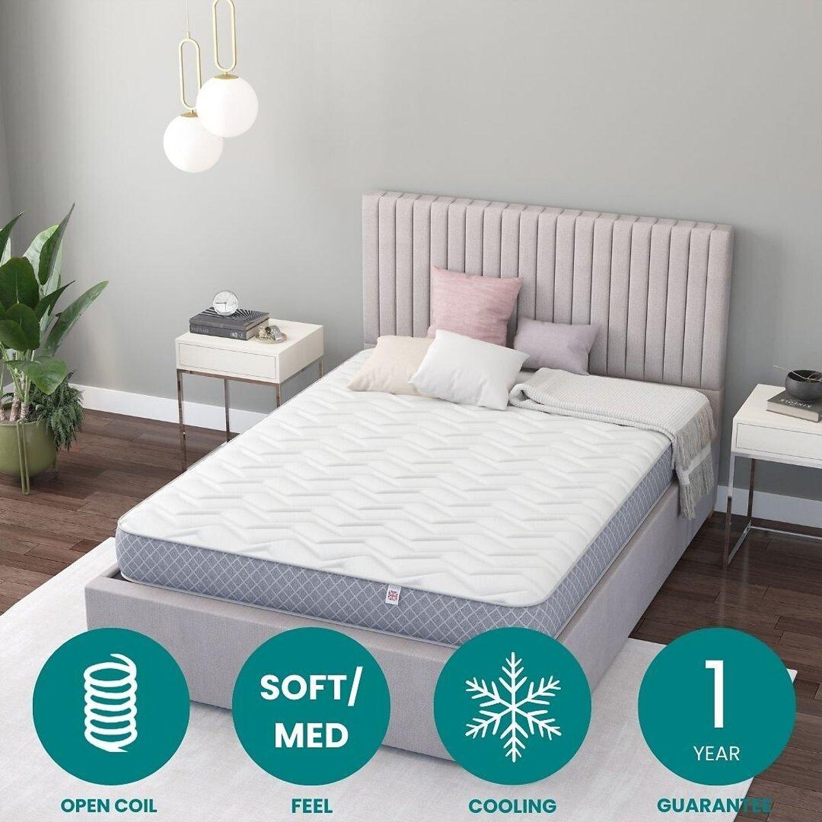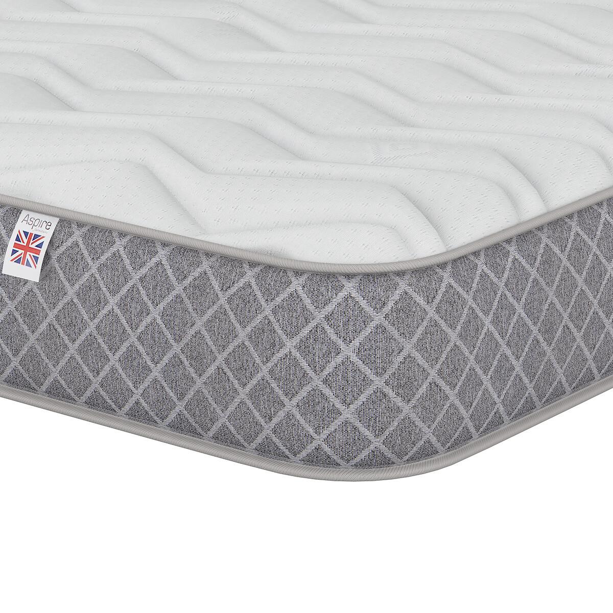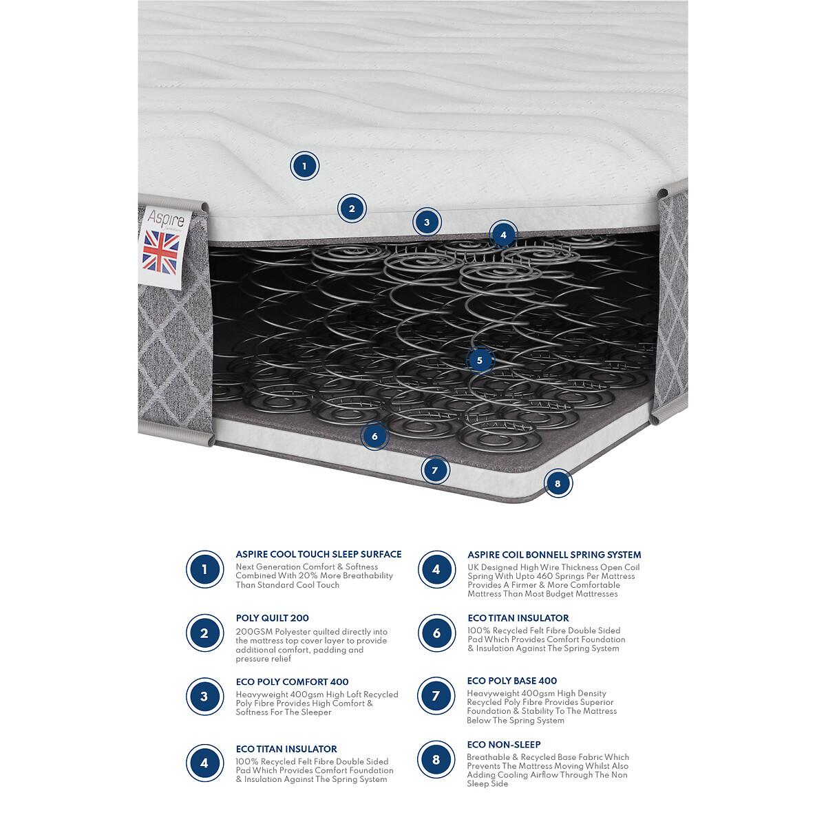 Designed for budget-conscious shoppers, this mattress features a Cool Touch sleeping surface to ensure a restful and comfortable night’s sleep, and contains layers of recycled fillings offering enhanced comfort while you sleep and peace of mind knowing you're making an eco-friendly choice. Product details • Open coil (Bonnell sprung) mattress. An open coil mattress can offer good pressure relief because the springs move together to evenly spread your body weight and relieve pressure from your joints, and can also help with your spinal alignment and your posture. • Double fillings with a generous 400g pad, with an additional 200g quilted into the cover • Cooling technology - The Aspire Cool Touch surface is up to 10x more breathable than standard fabrics and temperature regulating, ensuring a cooler, more comfortable sleep • Active pressure relieving sleep surface - luxurious diamond quilted design actively supports the body’s key pressure points for a stress free & pressure relieving night’s sleep • Eco insulator later and comfort layers - polyfibre comfort layers and felt double sided insulator pad made from recycled materials provide comfort and softness • Temperature regulating • Foam free • Medium-soft feel • Suitable for back, front and side sleepers • Anti allergy and anti dust-mite • Foam free • 20 cm depth • Handmade in the UK • Vacuum packed and rolled for easy shipping, to maintain freshness and reduce carbon emissions during transportation • 1 year manufacturer’s warranty Care information: Mattress can be slept on immediately after opening, but ideally, leave 3-4 hours to fully recover after opening. After around 30 nights, your mattress will start to contour to your body and the fillings will settle slightly. The fillings will settle in pressure point areas, and this simply means the mattress is performing correctly – supporting you where you need it most. Rotate your mattress regularly. Product Composition - open coil spring system, polyester. Product Dimensions Single 190 cm x 90 cm x 20 cm, Weight - 15 kg. Small Double 190 cm x 120 cm x 20 cm, Weight - 18.7 kg. Double 190 cm x 135 cm x 20 cm, Weight - 21.1 kg. King 190 cm x 150 cm x 20 cm, Weight - 23.4 kg Packaged Dimensions. Single: 98 cm x 35 cm x 30 cm, Weight 16 kg. Small Double: 129 cm x 35 cm x 30 cm, Weight 19.7 kg. Double: 144 cm x 35 cm x 30 cm, Weight 22.1 kg. King: 163 cm x 35 cm x 30 cm, Weight 24.4 kg. This product will be dispatched by one of our trusted suppliers. You’ll be contacted by their selected courier about your delivery. Please note this item will be delivered to your doorstep. Please note that this item cannot be delivered to the Offshore Islands, Northern Ireland or the Republic of Ireland