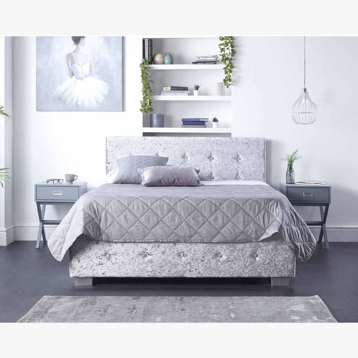 Aspire side lift ottoman bed in single size and a silver crushed velvet fabric. The ottoman storage can be set to access from left or right. Quality ottoman bed frrame with an upholstered buttoned finish.