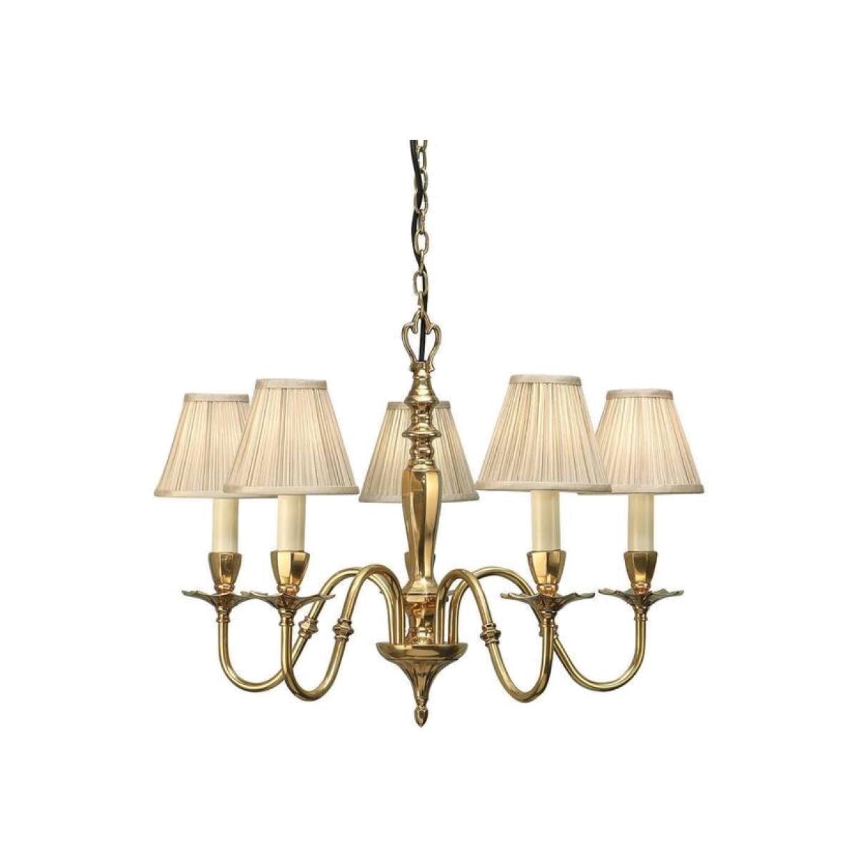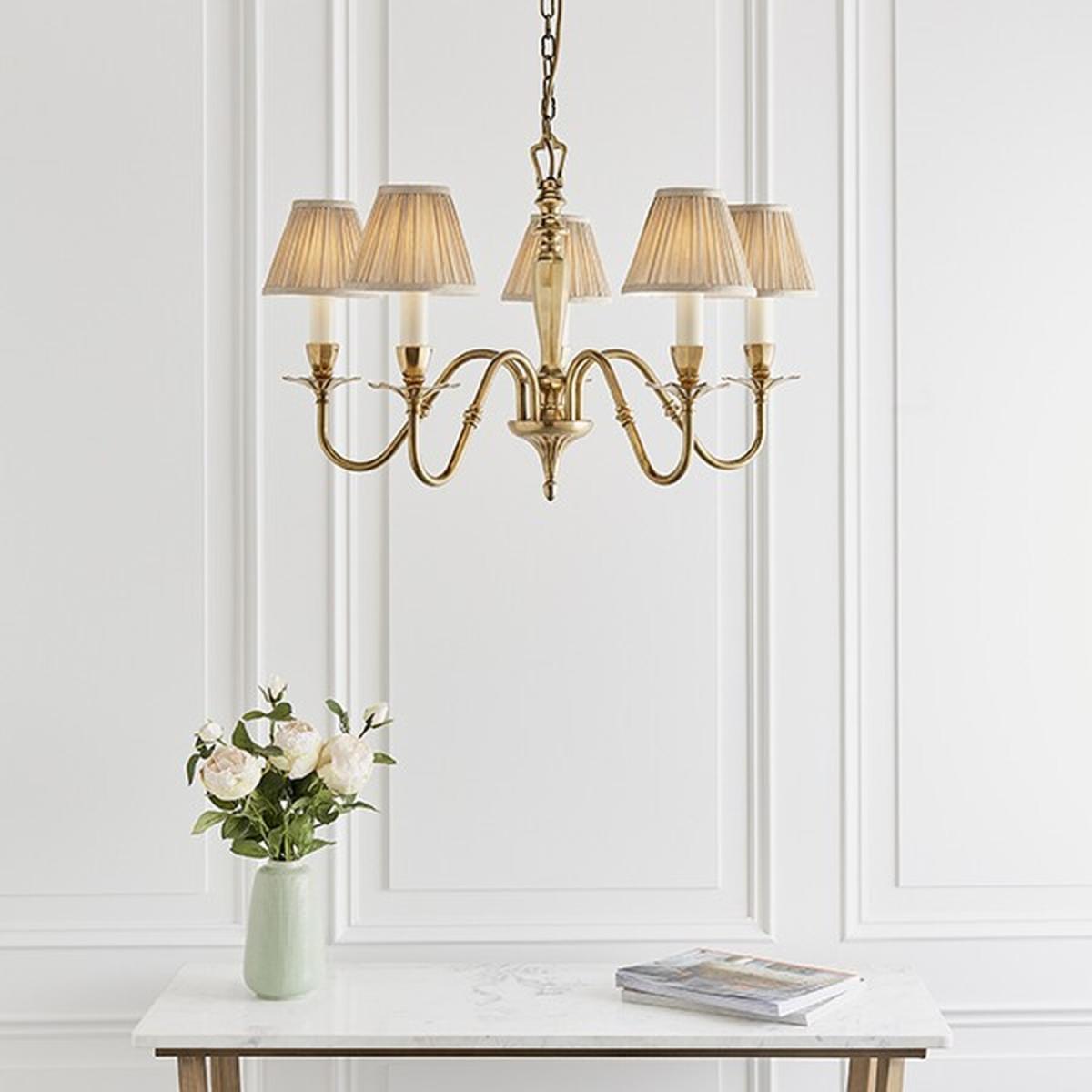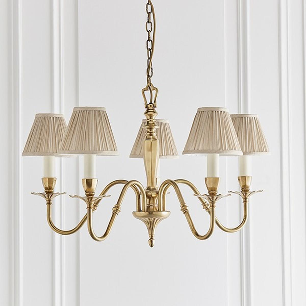 Asquith 5 Light Ceiling Pendant Chandelier Solid Brass, Beige fabric, E14 - Solid Brass