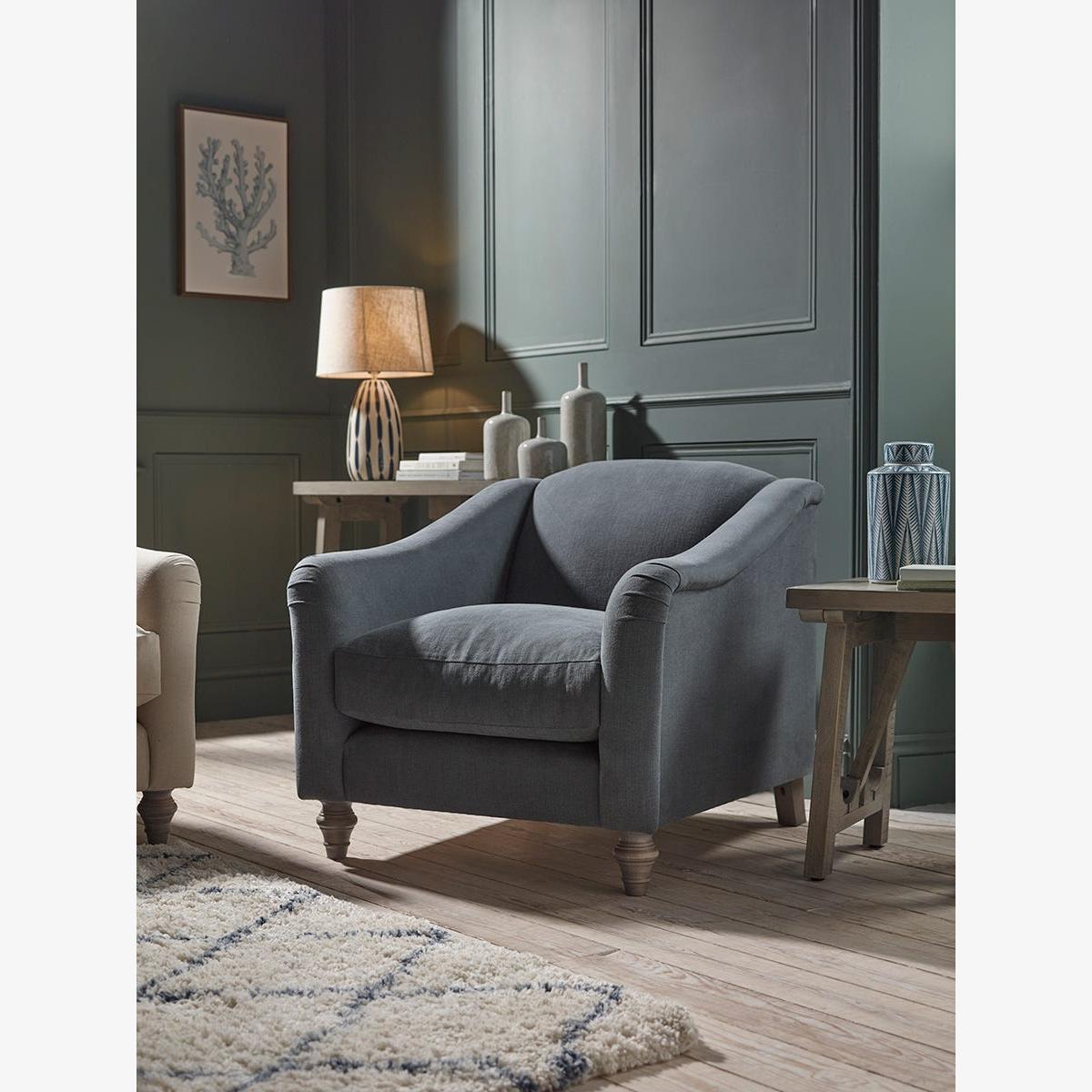 I love this stripe armchair for its relaxed yet tailored look - the soft blue cotton stripe brings in just enough pattern without overwhelming a space. Its generous curves and sloped arms make it a great focal point in a living room or snug reading corner, and the solid beech legs lift the design with a subtle traditional feel. It works particularly well in coastal-inspired, modern farmhouse or Scandi-chic interiors. Keep the look fresh by pairing it with a neutral wool throw, a simple jute rug and a raw-wood side table. For a touch of contrast, add a velvet cushion in a warm ochre or deep teal and finish with a slim brass floor lamp to highlight its comfortable silhouette.
