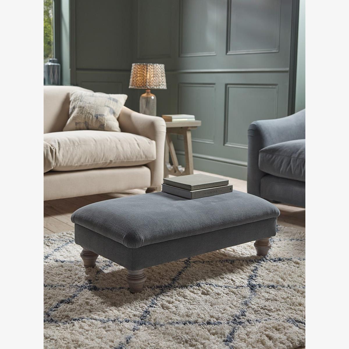 I love this footstool for its versatile Pebble Blue canvas, which adds a subtle splash of colour without overpowering a room. It works particularly well in cosy, neutral interiors or coastal-inspired spaces, where its relaxed yet refined aesthetic complements both traditional and contemporary styles. Practical styling tips include using it as a handy footrest in front of a statement sofa, or as extra seating when entertaining. Its understated design provides flexibility - drape a throw over it for added texture or pair it with soft cushions to create a layered, inviting look. This piece is a smart, functional addition that enhances comfort and style in any living space.