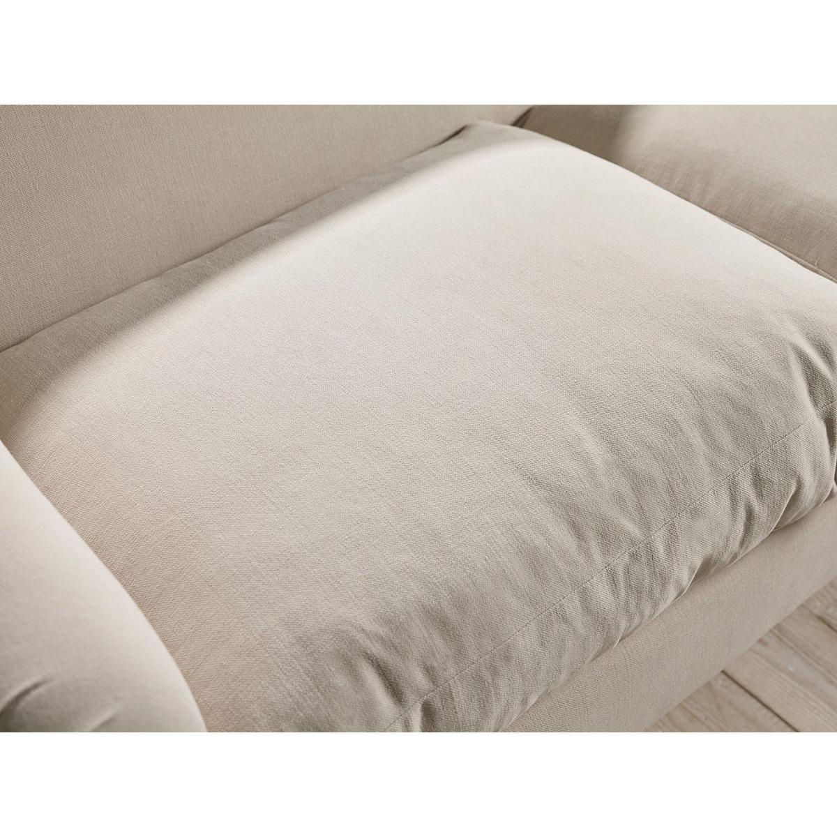 I love this sofa for its classic yet versatile appeal, making it a great anchor piece in both traditional and contemporary interiors. The warm sand tone is neutral enough to blend seamlessly with a variety of colour palettes, while the wide cotton stripe adds a subtle texture that brings visual interest without overwhelming the space. It works particularly well in relaxed, cosy living rooms or those aiming for a relaxed elegance. When styling around it, consider pairing with soft cushions in muted tones or rich textures to complement the stripe, and a cosy throw for added comfort. The size and shape mean it can be paired with contrasting accent chairs or a statement coffee table to create a balanced, inviting setup.