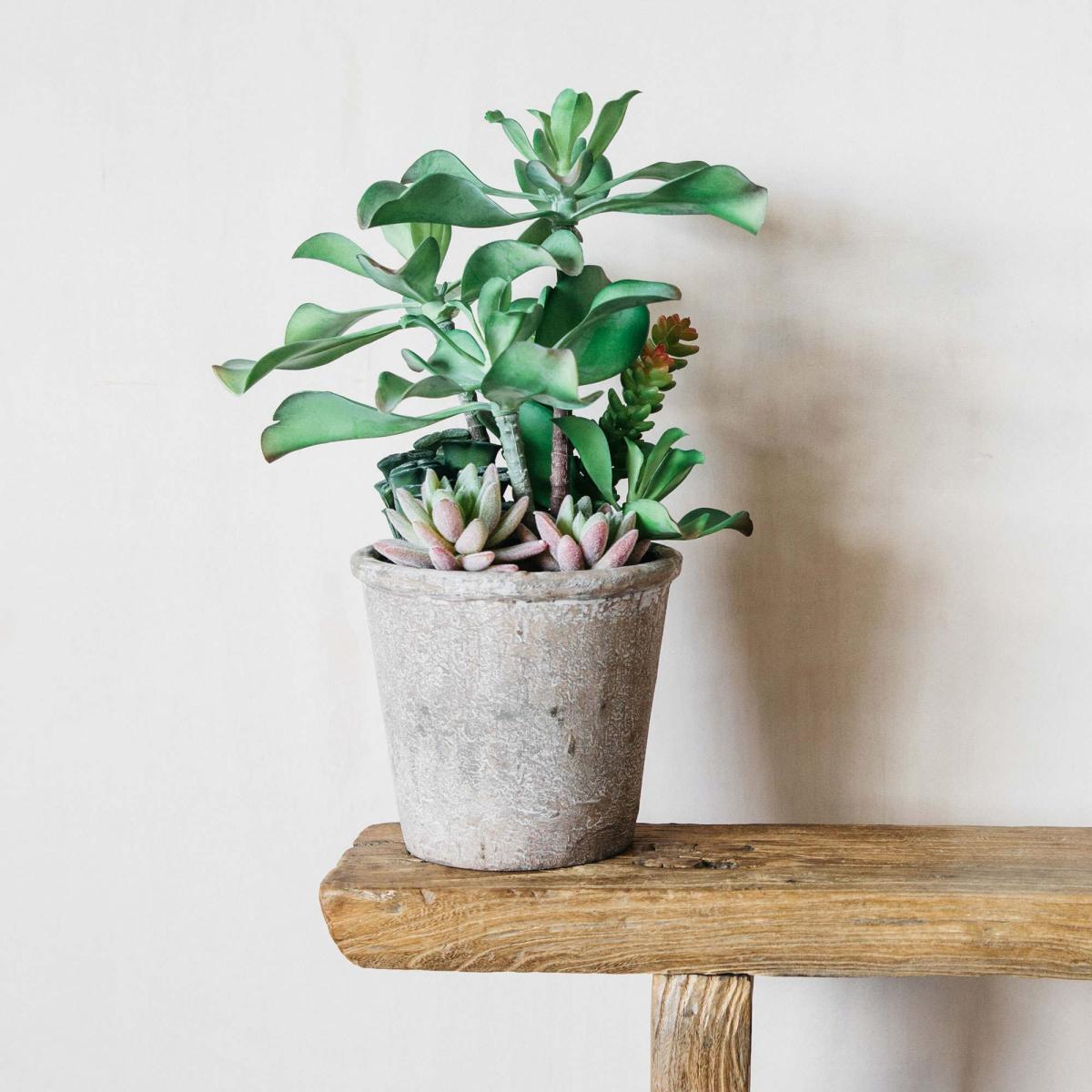 Bring the outside in with this faux succulent display in a rustic pot. Perfect for creating textured arrangements in your home.