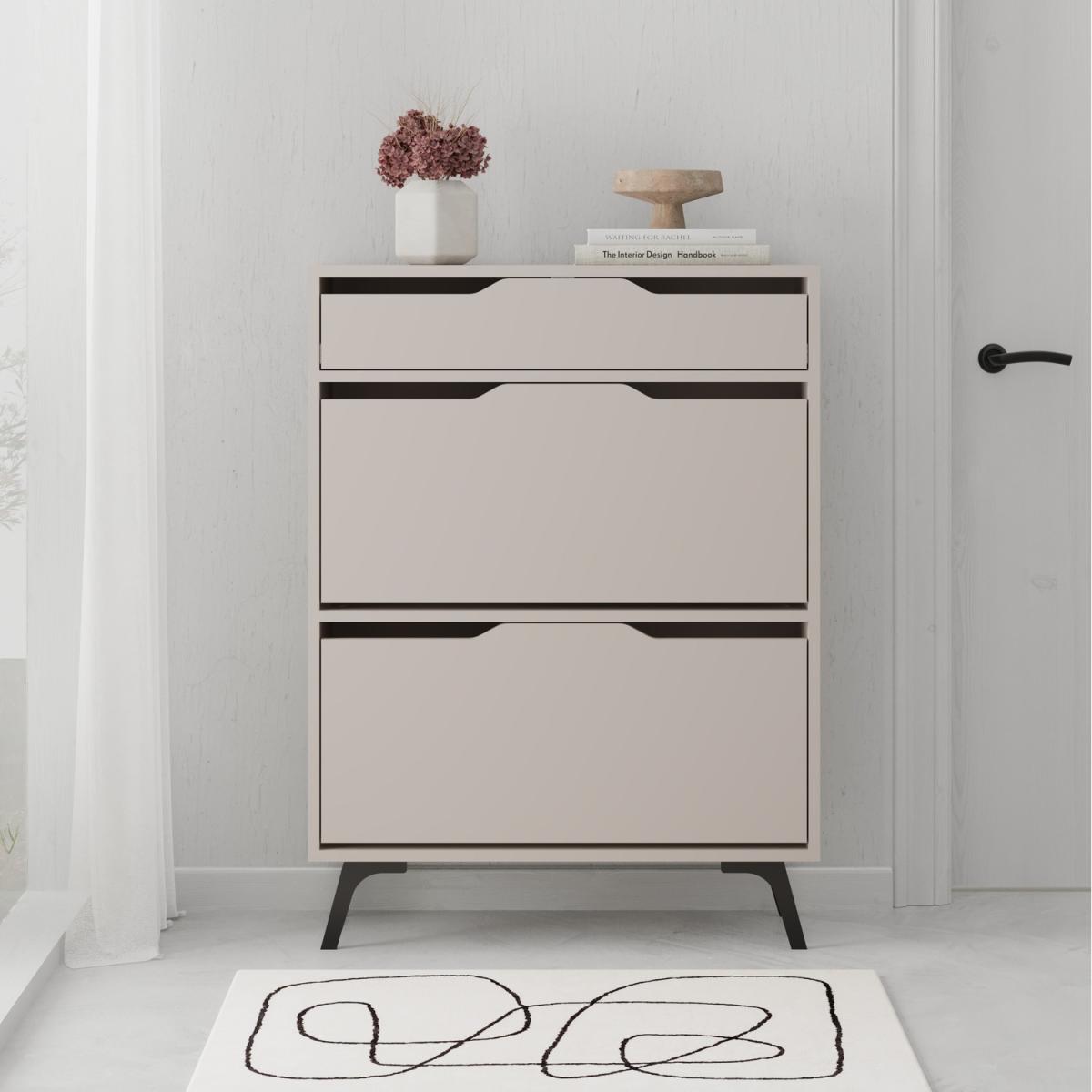Enhance your home organization with the Asta Modern Shoe Cabinet. This sleek and stylish shoe storage solution is perfect for keeping your entryway, hallway, or bedroom clutter-free. The Asta Shoe Cabinet features three spacious compartments with tilt-out drawers, allowing you to store and easily access up to 18 pairs of shoes. A convenient top drawer offers additional storage for small accessories like keys, wallets, and shoe care items. Made from high-quality engineered wood with a smooth white finish, this cabinet not only provides functionality but also complements any contemporary decor.