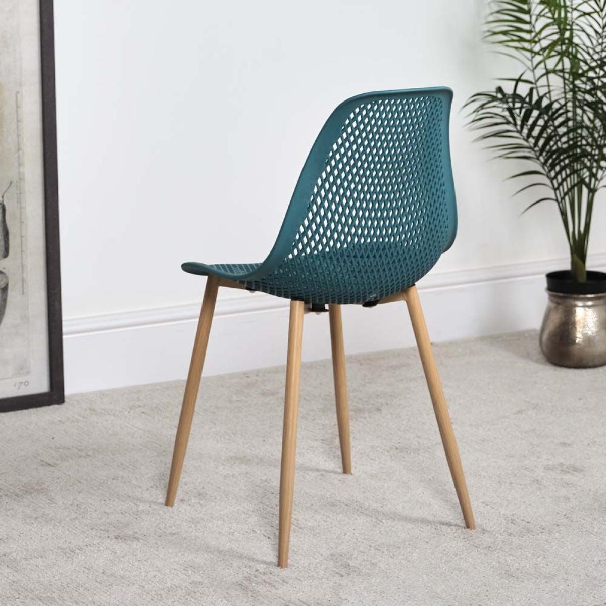 The Aster Dining Chair in turquoise blue is a moulded monobloc chair made from polypropylene with an enhanced lightweight ergonomic shape. The legs are sturdy metal designed for strength with a contemporary faux oak wrap covering giving a modern look that will fit with a range of interiors.