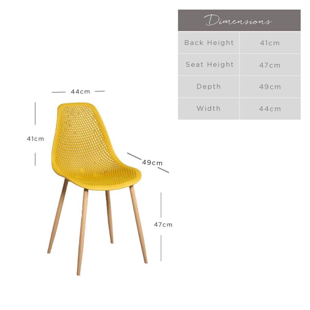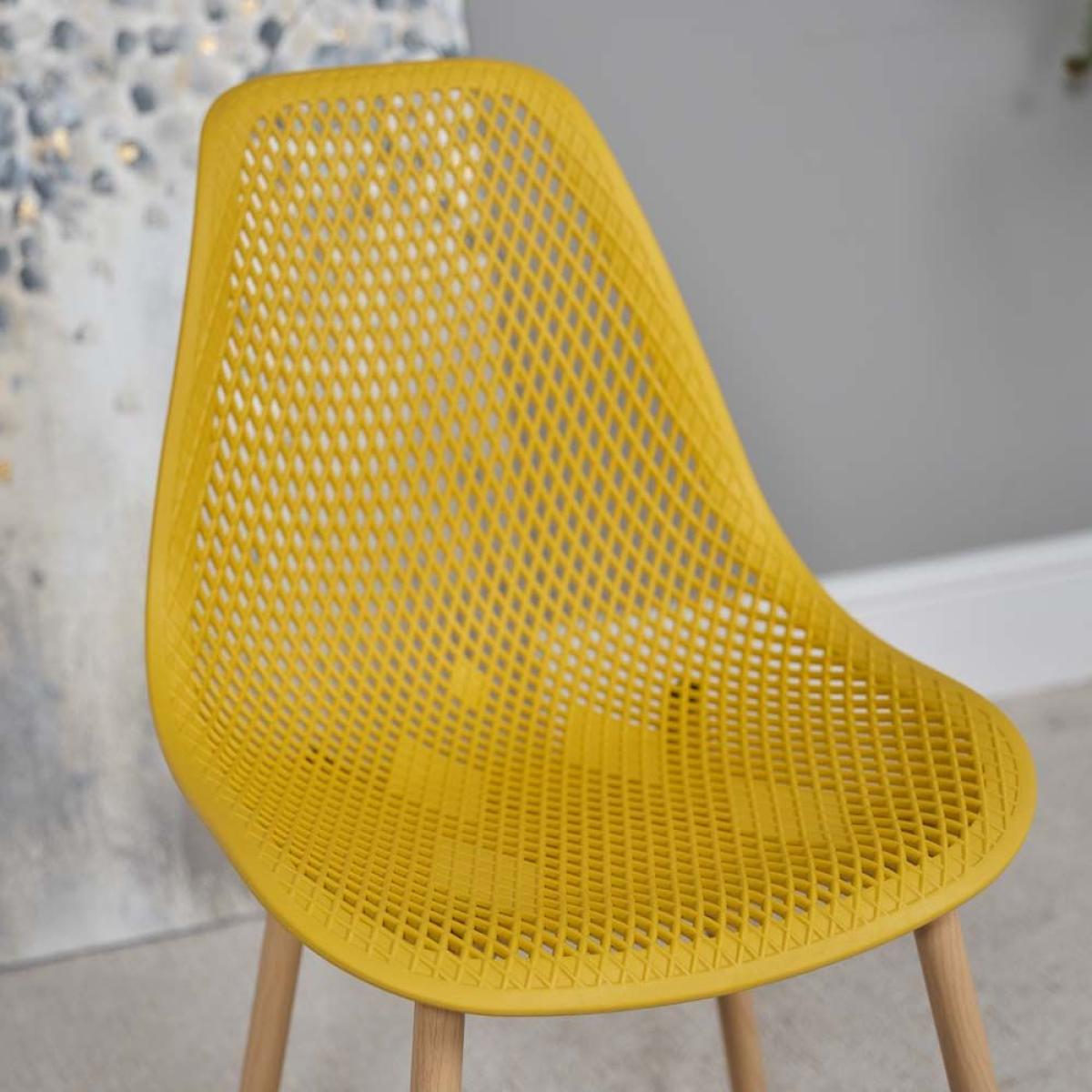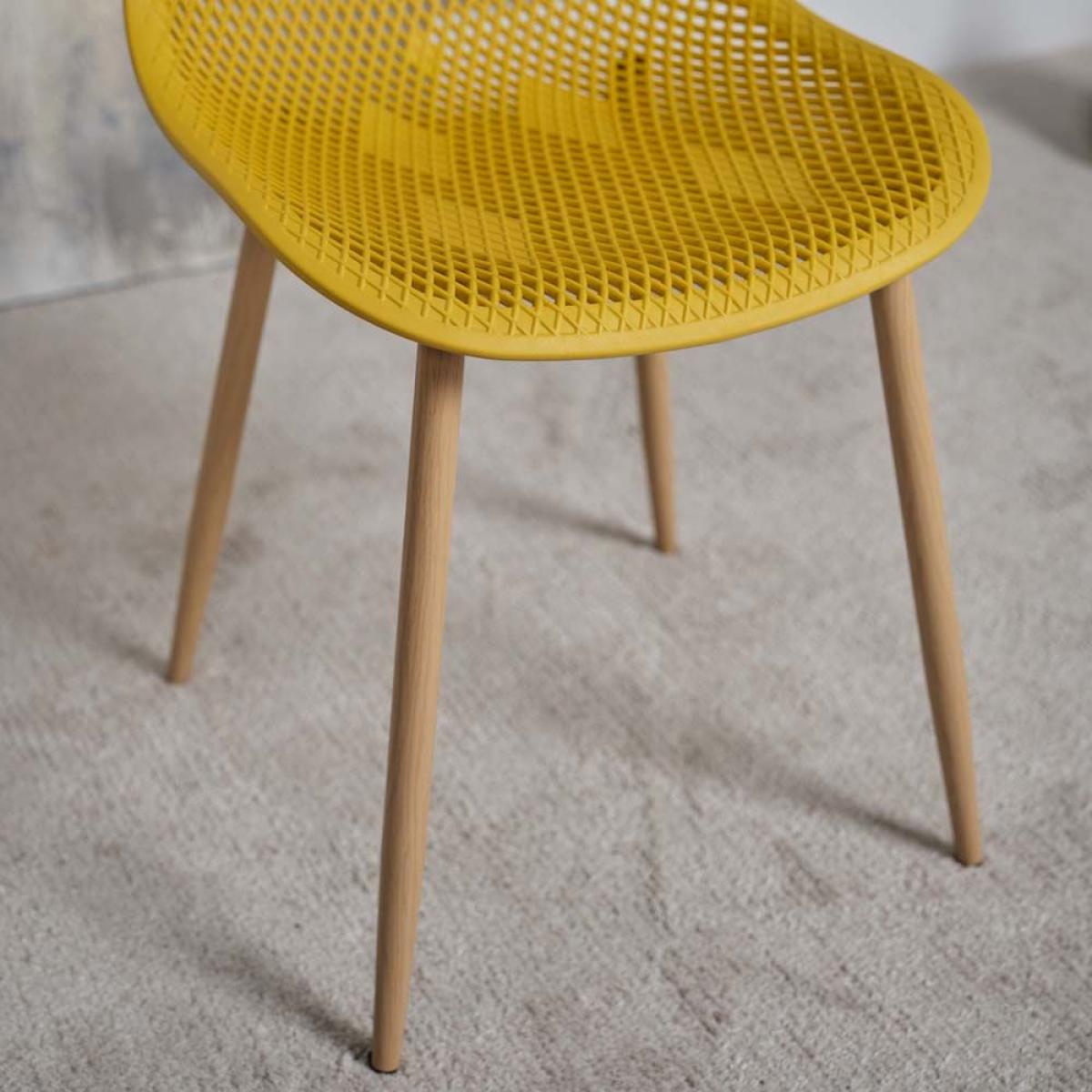 The Aster Dining Chair in yellow will add a stylish touch of colour to any dining setting. It can easily be added with other colours in the Aster range. Featuring a slightly bucketed moulded polypropylene seat for comfort. With modern faux oak wrap legs with metal internally for support. Metal legs with a faux oak wrap Moulded polypropylene seat. Sold as a pair. Simple Self Assembly. Dimensions: W44cm x D49cm x Seat Height: 47cm x Back Height 41cm