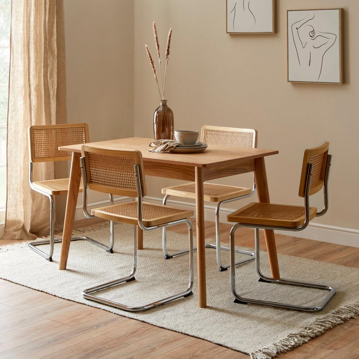 I love the Aster dining set for its clean, contemporary look that seamlessly blends natural oak tones with a touch of minimalism. The light oak finish makes it versatile enough to fit into both Scandi-inspired interiors and more eclectic, warm spaces. The Naya cane chairs add texture and a soft, tactile element that elevates the overall aesthetic while remaining practical for everyday use. When styling, consider pairing it with neutral or pastel colour palettes to keep the setting light and airy, or add bold accent colours through accessories like placemats or cushions. To keep the space balanced, a large statement piece on the table or a colourful rug underneath can do wonders, but it’s equally attractive kept simple for a relaxed dining experience.