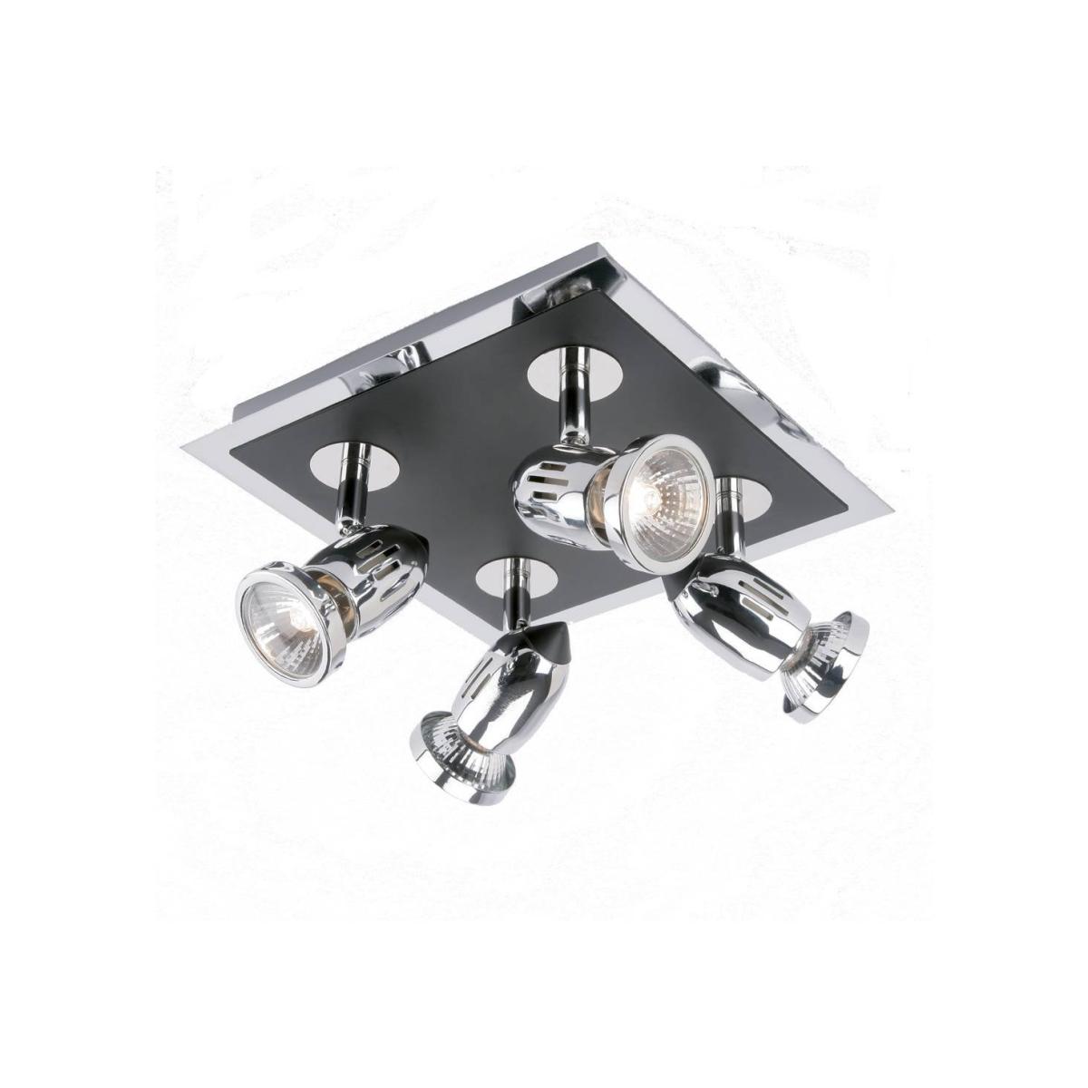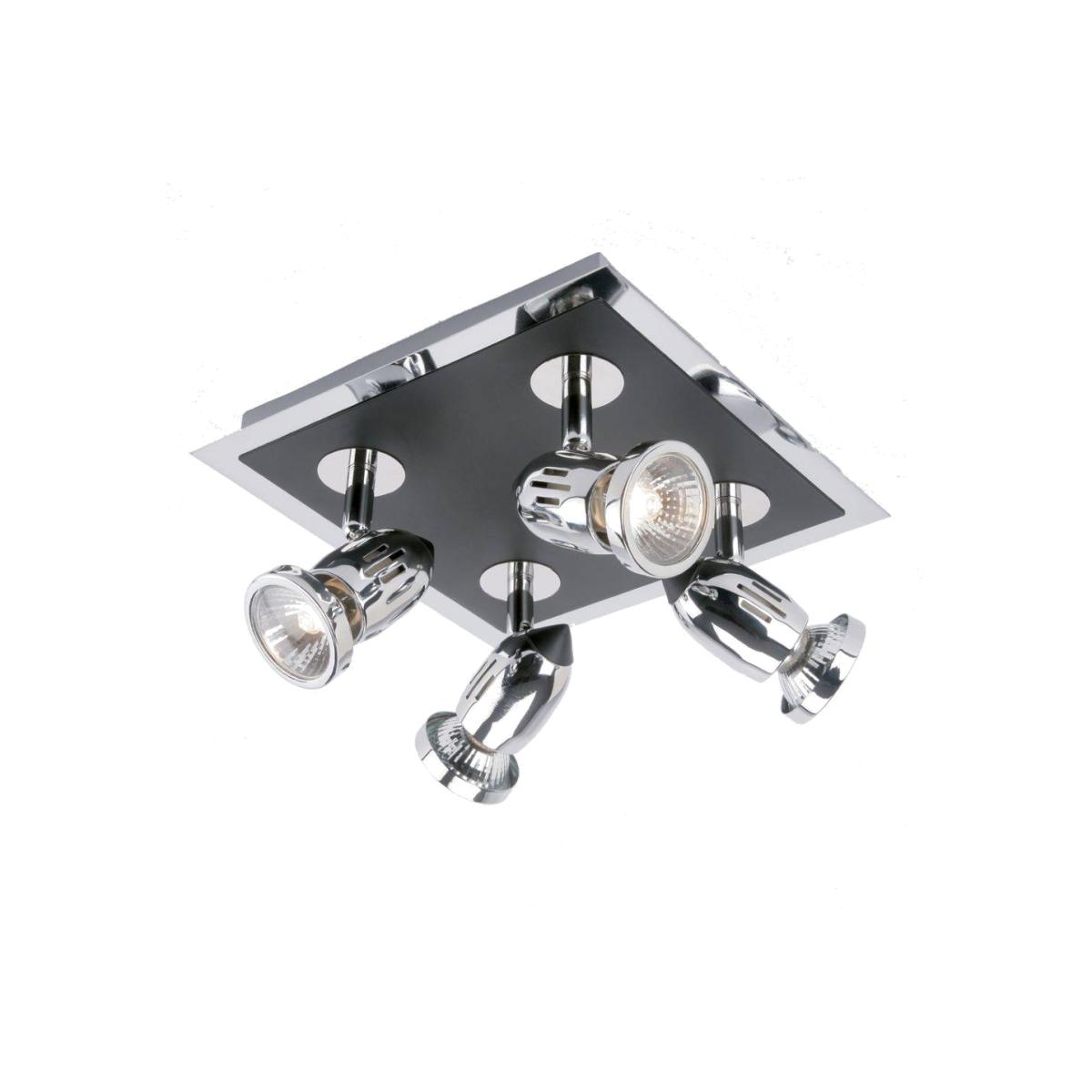 Asteris 4 Spotlight Plate. The Asteris 4 Spotlight Plate is a sleek and stylish ceiling light fitting. The contemporary design is finished in polished chrome and black and features four spotlight lamps which suspend from a square ceiling plate.