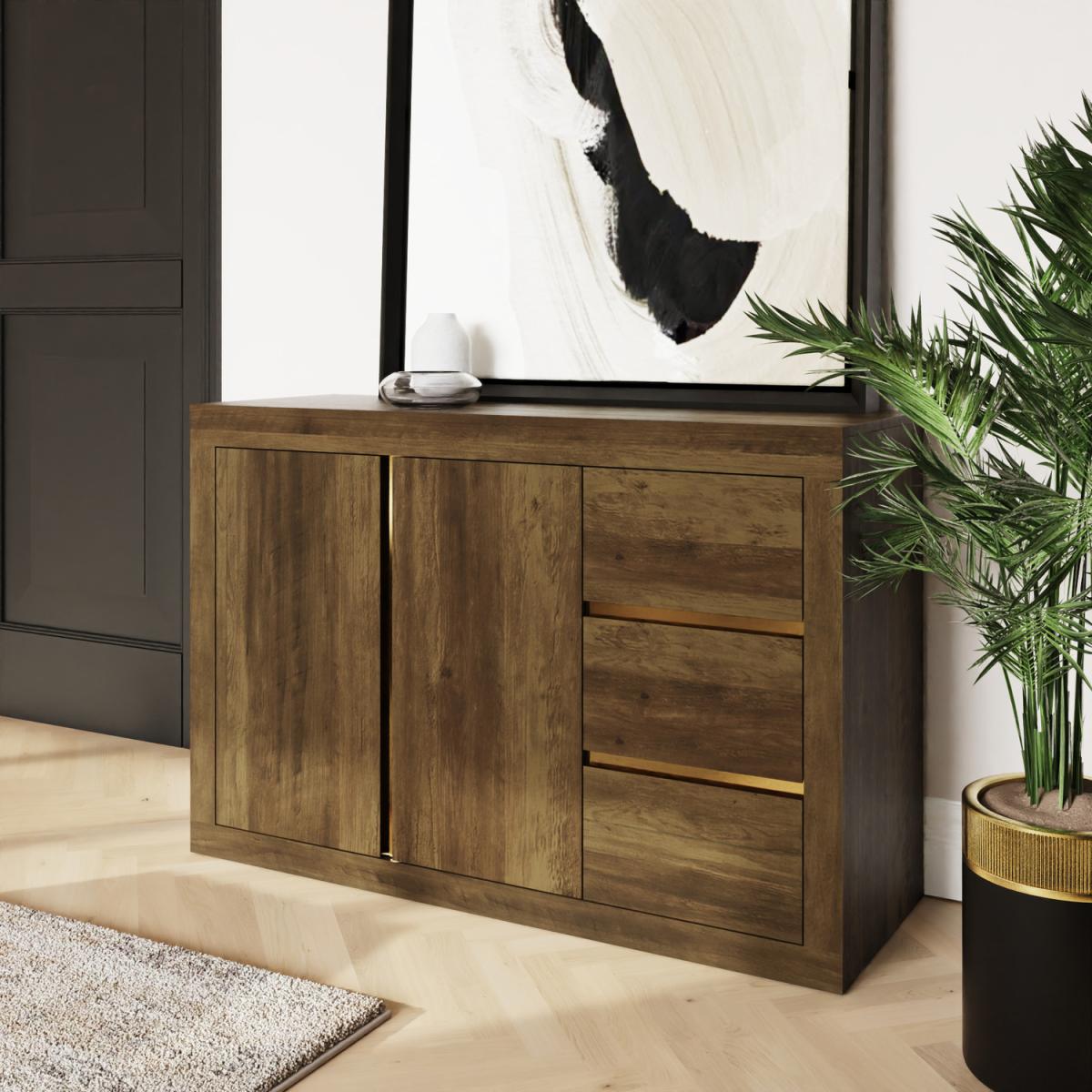 Sleek, stylish, and practical. The Astley Sideboard is the perfect blend of form and function. Finished in a warm Knotty Oak effect with elegant gold accents, this modern oak sideboard adds a sophisticated touch to any dining room, hallway, or living area. With three finger-pull drawers and two finger-pull doors, it offers ample storage for dinnerware, linens, or everyday essentials. Clean lines and a bold design make this contemporary sideboard a standout piece in any modern home.