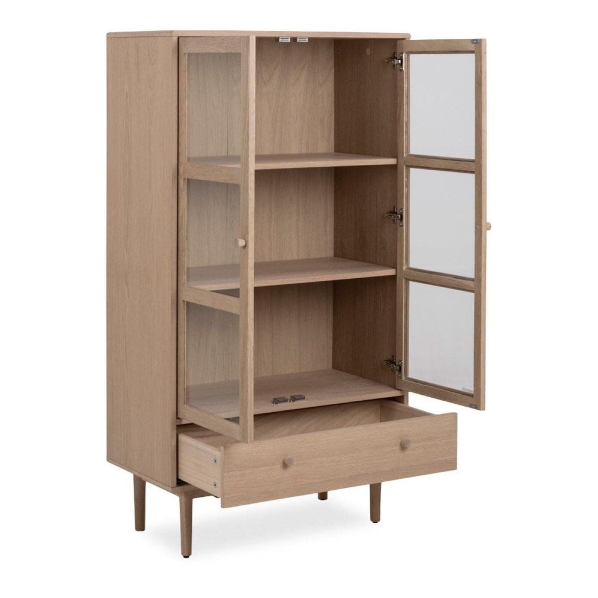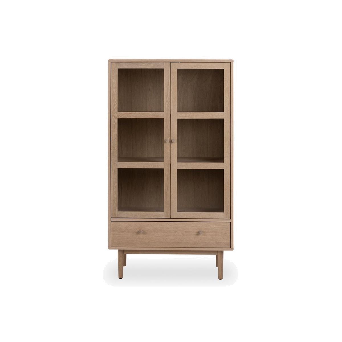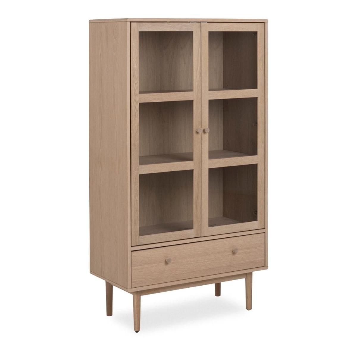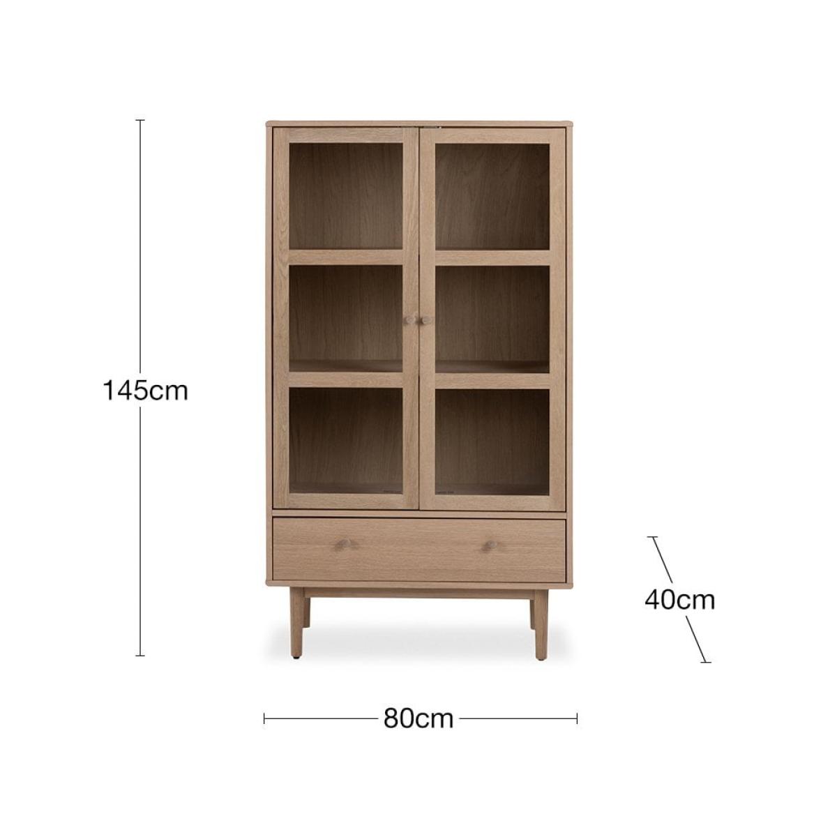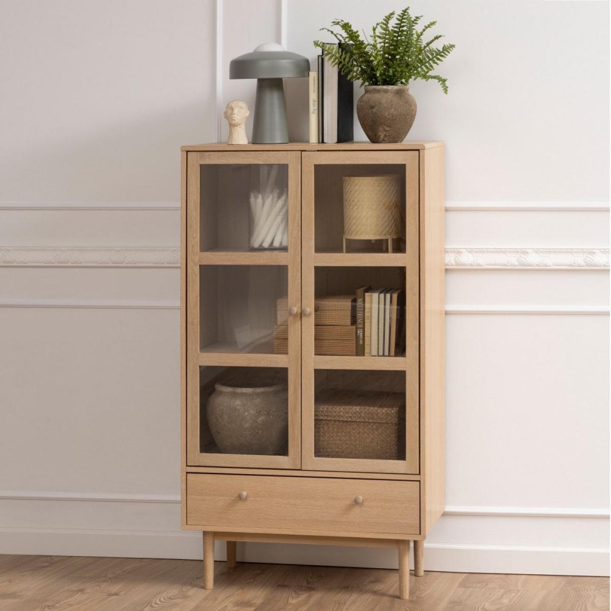 This solid and sturdy oak cabinet, with its Scandinavian design, is a timeless and elegant solution to your storage needs. The two sleek glass doors and adjustable shelves provide space for all items while the large drawer underneath offers an additional storage solution.